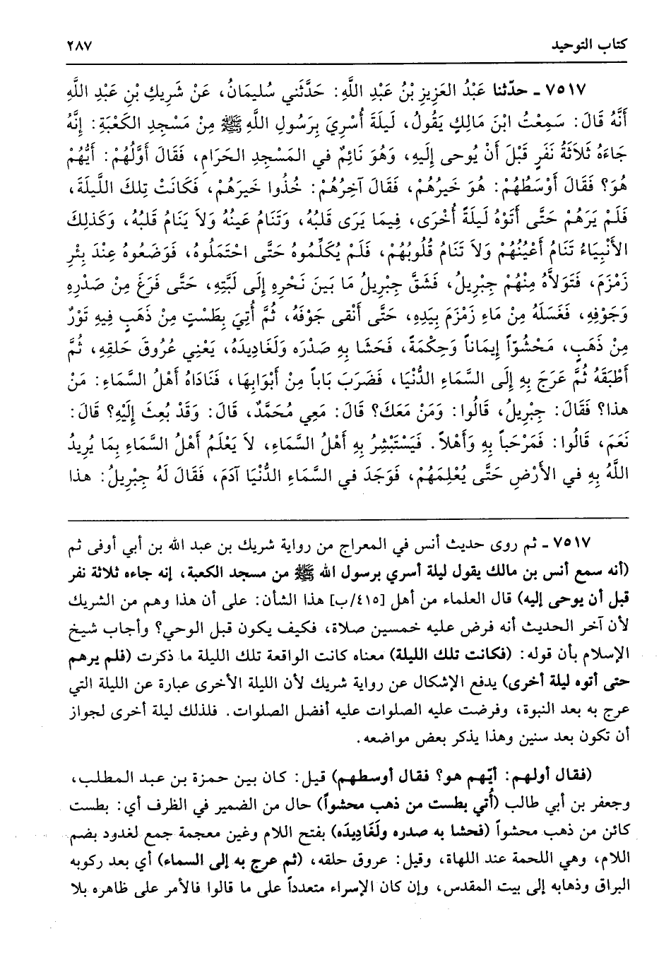 7517 - حَدَّثَنَا عَبْدُ الْعَزِيزِ بْنُ عَبْدِ اللَّهِ حَدَّثَنِى سُلَيْمَانُ عَنْ شَرِيكِ بْنِ عَبْدِ اللَّهِ أَنَّهُ قَالَ سَمِعْتُ ابْنَ مَالِكٍ يَقُولُ لَيْلَةَ أُسْرِىَ بِرَسُولِ اللَّهِ - صلى الله عليه وسلم - مِنْ مَسْجِدِ الْكَعْبَةِ أَنَّهُ جَاءَهُ ثَلاَثَةُ نَفَرٍ قَبْلَ أَنْ يُوحَى إِلَيْهِ وَهْوَ نَائِمٌ فِي الْمَسْجِدِ الْحَرَامِ، فَقَالَ أَوَّلُهُمْ أَيُّهُمْ هُوَ فَقَالَ أَوْسَطُهُمْ هُوَ خَيْرُهُمْ. فَقَالَ آخِرُهُمْ خُذُوا خَيْرَهُمْ. فَكَانَتْ تِلْكَ اللَّيْلَةَ، فَلَمْ يَرَهُمْ حَتَّى أَتَوْهُ لَيْلَةً أُخْرَى فِيمَا يَرَى قَلْبُهُ، وَتَنَامُ عَيْنُهُ وَلاَ يَنَامُ قَلْبُهُ وَكَذَلِكَ الأَنْبِيَاءُ تَنَامُ أَعْيُنُهُمْ وَلاَ تَنَامُ قُلُوبُهُمْ، فَلَمْ يُكَلِّمُوهُ حَتَّى احْتَمَلُوهُ فَوَضَعُوهُ عِنْدَ بِئْرِ زَمْزَمَ فَتَوَلاَّهُ مِنْهُمْ جِبْرِيلُ فَشَقَّ جِبْرِيلُ مَا بَيْنَ نَحْرِهِ إِلَى لَبَّتِهِ حَتَّى فَرَغَ مِنْ صَدْرِهِ وَجَوْفِهِ، فَغَسَلَهُ مِنْ مَاءِ زَمْزَمَ بِيَدِهِ، حَتَّى أَنْقَى جَوْفَهُ، ثُمَّ أُتِىَ بِطَسْتٍ مِنْ ذَهَبٍ فِيهِ تَوْرٌ مِنْ ذَهَبٍ مَحْشُوًّا إِيمَانًا وَحِكْمَةً، فَحَشَا بِهِ صَدْرَهُ وَلَغَادِيدَهُ - يَعْنِى عُرُوقَ حَلْقِهِ - ثُمَّ أَطْبَقَهُ ثُمَّ عَرَجَ بِهِ إِلَى السَّمَاءِ الدُّنْيَا فَضَرَبَ بَابًا مِنْ أَبْوَابِهَا فَنَادَاهُ أَهْلُ السَّمَاءِ مَنْ هَذَا فَقَالَ جِبْرِيلُ. قَالُوا وَمَنْ مَعَكَ قَالَ مَعِى مُحَمَّدٌ. قَالَ وَقَدْ بُعِثَ قَالَ نَعَمْ. قَالُوا فَمَرْحَبًا بِهِ وَأَهْلاً. فَيَسْتَبْشِرُ بِهِ أَهْلُ السَّمَاءِ، لاَ يَعْلَمُ أَهْلُ السَّمَاءِ بِمَا يُرِيدُ اللَّهُ بِهِ فِي الأَرْضِ حَتَّى يُعْلِمَهُمْ، فَوَجَدَ فِي السَّمَاءِ الدُّنْيَا آدَمَ فَقَالَ لَهُ جِبْرِيلُ: هذا