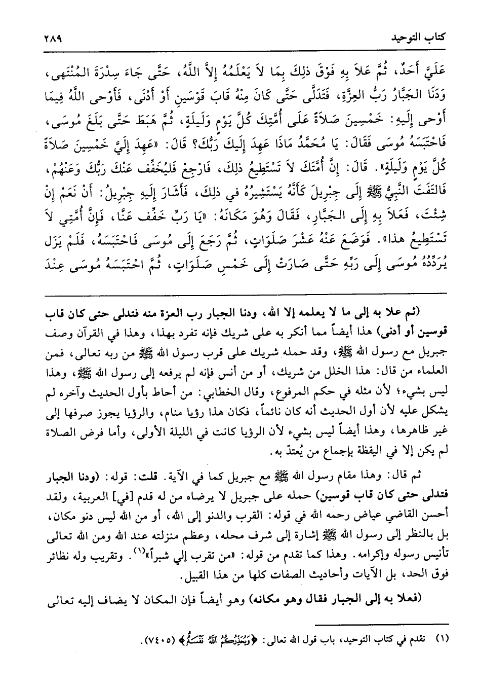 ثم قال: وهذا مقام رسول الله -صلى الله عليه وسلم- مع جبريل كما في الآية. قلت: قوله: (ودنا الجبار فتدلى حتى كان قاب قوسين) حمله على جبريل لا يرضاه من له قدم [في] العربية، ولقد أحسن القاضي عياض رحمه الله في قوله: القرب والدنو إلى الله، أو من الله ليس دنو مكان، بل بالنظر إلى رسول الله -صلى الله عليه وسلم- إشارة إلى شرف محله، وعظم منزلته عند الله ومن الله تعالى تأنيس رسوله وإكرامه. وهذا كما تقدم من قوله: "من تقرب إلى شبرًا". وتقريب وله نظائر فوق الحد، بل الآيات وأحاديث الصفات كلها من هذا القبيل.