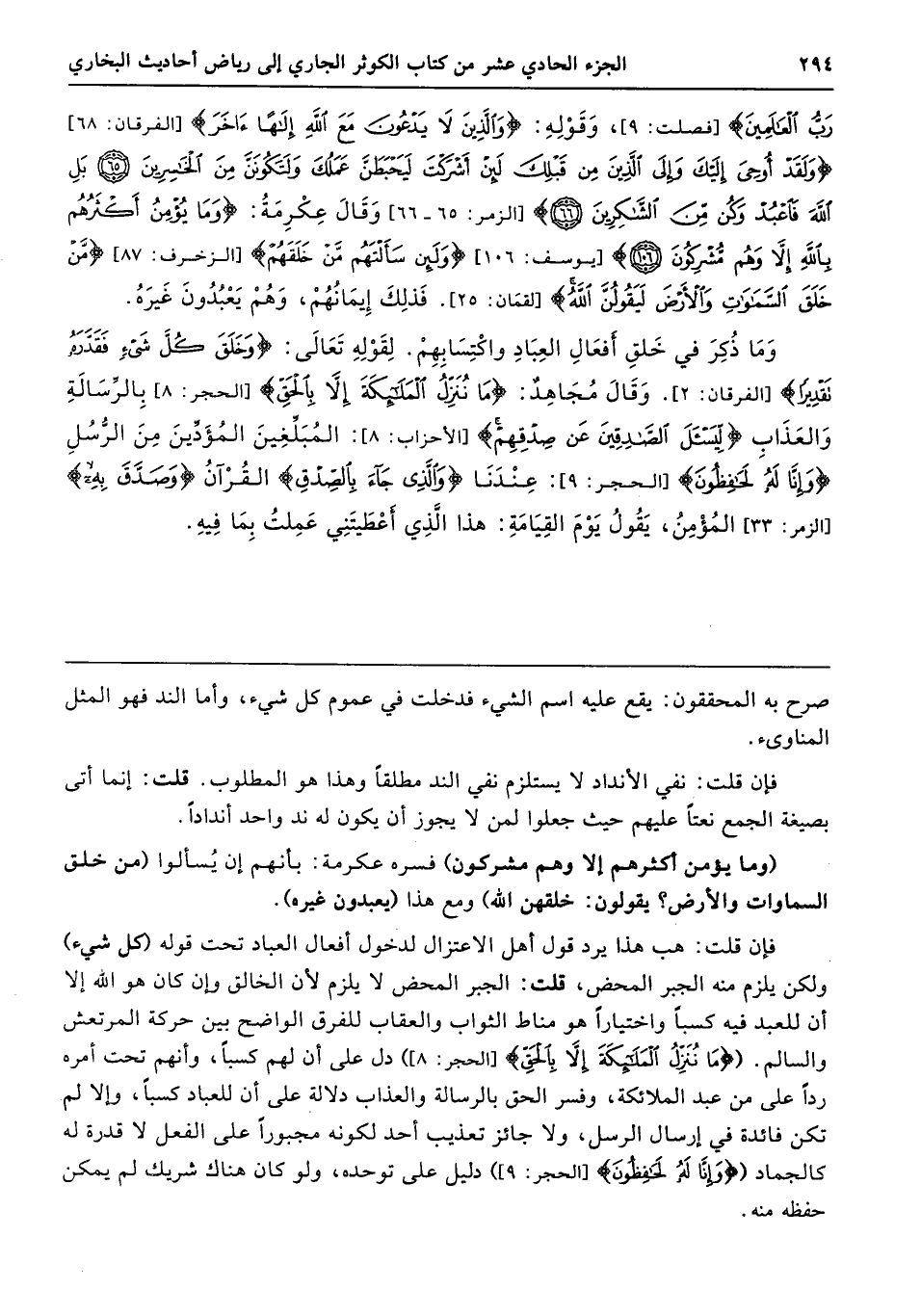 رَبُّ الْعَالَمِينَ) وَقَوْلِهِ (وَالَّذِينَ لاَ يَدْعُونَ مَعَ اللَّهِ إِلَهًا آخَرَ) (وَلَقَدْ أُوحِىَ إِلَيْكَ وَإِلَى الَّذِينَ مِنْ قَبْلِكَ لَئِنْ أَشْرَكْتَ لَيَحْبَطَنَّ عَمَلُكَ وَلَتَكُونَنَّ مِنَ الْخَاسِرِينَ * بَلِ اللَّهَ فَاعْبُدْ وَكُنْ مِنَ الشَّاكِرِينَ) وَقَالَ عِكْرِمَةُ (وَمَا يُؤْمِنُ أَكْثَرُهُمْ بِاللَّهِ إِلاَّ وَهُمْ مُشْرِكُونَ) وَلَئِنْ سَأَلْتَهُمْ مَنْ خَلَقَهُمْ وَمَنْ خَلَقَ السَّمَوَاتِ وَالأَرْضَ لَيَقُولُنَّ اللَّهُ. فَذَلِكَ إِيمَانُهُمْ وَهُمْ يَعْبُدُونَ غَيْرَهُ، وَمَا ذُكِرَ فِي خَلْقِ أَفْعَالِ الْعِبَادِ وَأَكْسَابِهِمْ لِقَوْلِهِ تَعَالَى (وَخَلَقَ كُلَّ شَىْءٍ فَقَدَّرَهُ تَقْدِيرًا) وَقَالَ مُجَاهِدٌ مَا تَنَزَّلُ الْمَلاَئِكَةُ إِلاَّ بِالْحَقِّ بِالرِّسَالَةِ وَالْعَذَابِ (لِيَسْأَلَ الصَّادِقِينَ عَنْ صِدْقِهِمْ) الْمُبَلِّغِينَ الْمُؤَدِّينَ مِنَ الرُّسُلِ وَإِنَّا لَهُ حَافِظُونَ عِنْدَنَا (وَالَّذِى جَاءَ بِالصِّدْقِ) الْقُرْآنُ، (وَصَدَّقَ بِهِ) الْمُؤْمِنُ يَقُولُ يَوْمَ الْقِيَامَةِ هَذَا الَّذِى أَعْطَيْتَنِى عَمِلْتُ بِمَا فِيهِ.