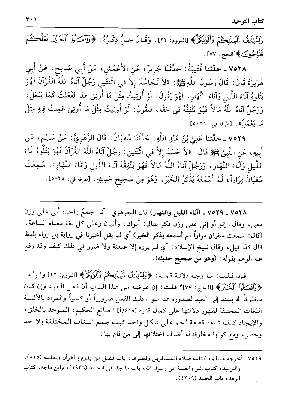 7528 - 7529 - (آناء الليل والنهار) قال الجوهري: آناء جمعٌ واحده أنى على وزن معى، وقال: إنو أو إني على وزن فكر يقال: أنوان، وأنيان وعلى كل لغة معناه الساعة. (قال: سمعت سفيان مرارًا لم أسمعه يذكر الخبر) أي لم يقل أخبرنا في رواية بل رواه بلفظ قال كذا قيل، وقال شيخ الإسلام: أي لم يروه إلا عنعنة ولا ضرر في ذلك كيف وقد رفع عنه الوهم بقوله: (وهو من صحيح حديثه).