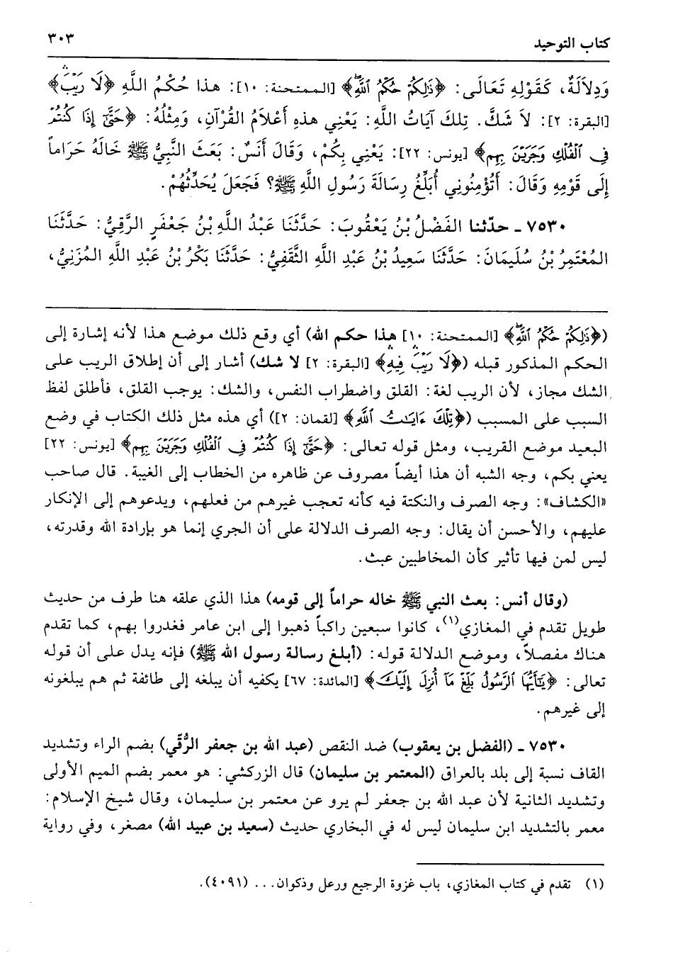 7530 - (الفضل بن يعقوب) ضد النقص (عبد الله بن جعفر الرُّقّي) بضم الراء وتشديد القاف نسبة إلى بلد بالعراق (المعتمر بن سليمان) قال الزركشي: هو معمر بضم الميم الأولى وتشديد الثانية لأن عبد الله بن جعفر لم يرو عن معتمر بن سليمان، وقال شيخ الإسلام: معمر بالتشديد ابن سليمان ليس له في البخاري حديث (سعيد بن عبيد الله) مصغر، وفي رواية