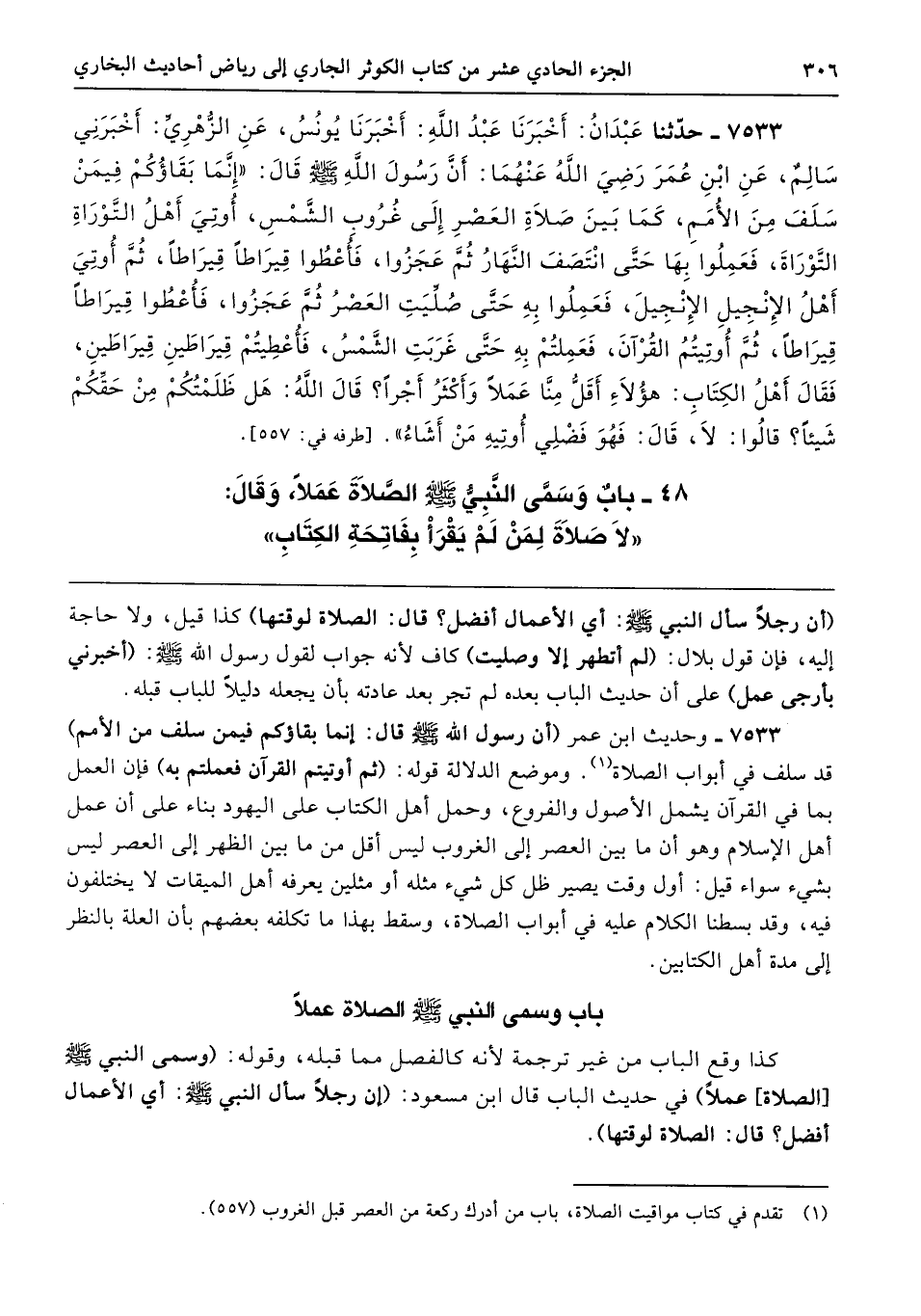 7533 - وحديث ابن عمر (أن رسول الله - صلى الله عليه وسلم - قال: إنما بقاؤكم فيمن سلف من الأمم) قد سلف في أبواب الصلاة. وموضع الدلالة قوله: (ثم أوتيتم القرآن فعملتم به) فإن العمل بما في القرآن يشمل الأصول والفروع، وحمل أهل الكتاب على اليهود بناء على أن عمل أهل الإسلام وهو أن ما بين العصر إلى الغروب ليس أقل من ما بين الظهر إلى العصر ليس بشيء سواء قيل: أول وقت يصير ظل كل شيء مثله أو مثلين يعرفه أهل الميقات لا يختلفون فيه، وقد بسطنا الكلام عليه في أبواب الصلاة، وسقط بهذا ما تكلفه بعضهم بأن العلة بالنظر إلى مدة أهل الكتابين.