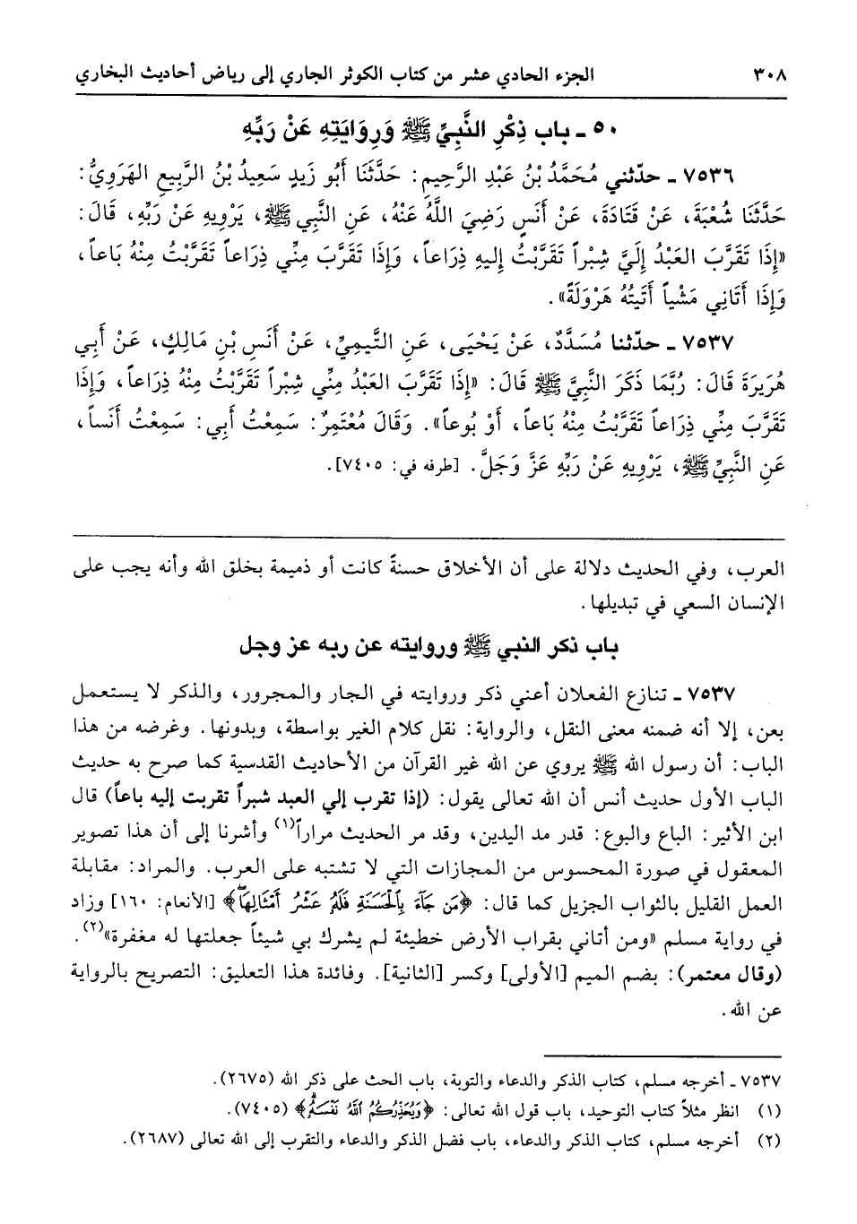 7537 - تنازع الفعلان أعني ذكر وروايته في الجار والمجرور، والذكر لا يستعمل بعن، إلا أنه ضمنه معنى النقل، والرواية: نقل كلام الغير بواسطة، وبدونها. وغرضه من هذا الباب: أن رسول الله - صلى الله عليه وسلم - يروي عن الله غير القرآن من الأحاديث القدسية كما صرح به حديث الباب الأول حديث أنس أن الله تعالى يقول: (إذا تقرب إلى العبد شبرًا تقربت إليه باعًا) قال ابن الأثير: الباع والبوع: قدر مد اليدين، وقد مر الحديث مرارًا وأشرنا إلى أن هذا تصوير المعقول في صورة المحسوس من المجازات التي لا تشتبه على العرب. والمراد: مقابلة العمل القليل بالثواب الجزيل كما قال: {مَنْ جَاءَ بِالْحَسَنَةِ فَلَهُ عَشْرُ أَمْثَالِهَا} [الأنعام: 160] وزاد في رواية مسلم "ومن أتاني بقراب الأرض خطيئة لم يشرك بي شيئًا جعلتها له مغفرة".