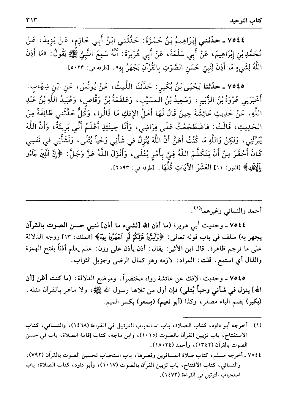 7545 - وحديث الإفك عن عائشة رواه مختصرًا. وموضع الدلالة: (ما كنت أظن [أن الله، ينزل في شأني وحيًا يُتلى) فإن أول من تلاها رسول الله - صلى الله عليه وسلم -، ولا ماهر بالقرآن مثله. (بكير) بضم الباء مصغر، وكذا (أبو نعيم) (مِسعر) بكسر الميم.