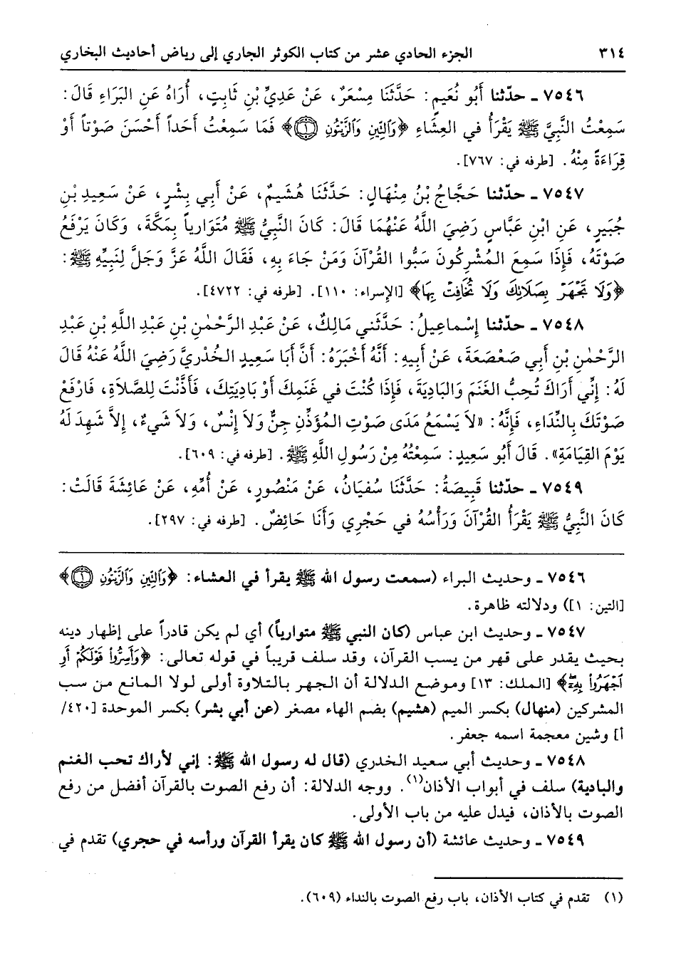 7548 - وحديث أبي سعيد الخدري (قال له رسول الله - صلى الله عليه وسلم -: إني لأراك تحب الغنم والبادية) سلف في أبواب الأذان. ووجه الدلالة: أن رفع الصوت بالقرآن أفضل من رفع الصوت بالأذان، فيدل عليه من باب الأولى.
