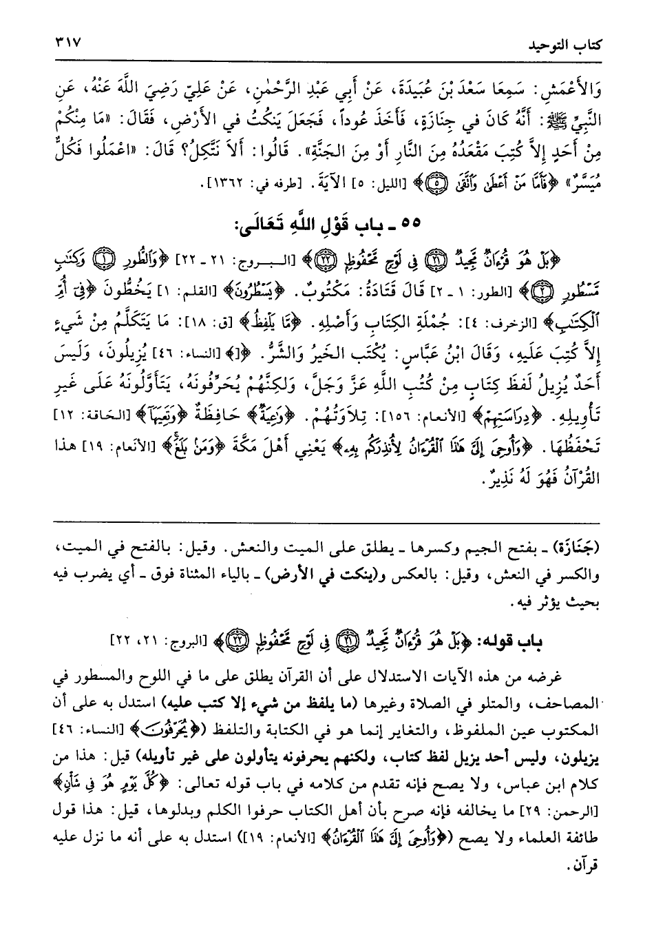 55 - باب قَوْلِ اللَّهِ تَعَالَى (بَلْ هُوَ قُرْآنٌ مَجِيدٌ * فِي لَوْحٍ مَحْفُوظٍ) (وَالطُّورِ * وَكِتَابٍ مَسْطُورٍ).