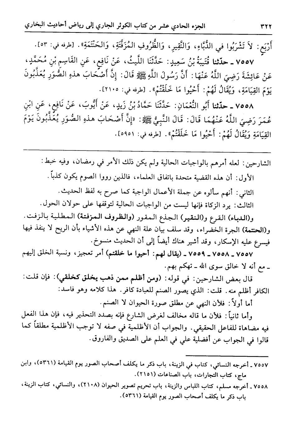 7558 - حَدَّثَنَا أَبُو النُّعْمَانِ حَدَّثَنَا حَمَّادُ بْنُ زَيْدٍ عَنْ أَيُّوبَ عَنْ نَافِعٍ عَنِ ابْنِ عُمَرَ - رضى الله عنهما - قَالَ قَالَ النَّبِىُّ - صلى الله عليه وسلم - «إِنَّ أَصْحَابَ هَذِهِ الصُّوَرِ يُعَذَّبُونَ يَوْمَ الْقِيَامَةِ، وَيُقَالُ لَهُمْ أَحْيُوا مَا خَلَقْتُمْ». طرفه 5951