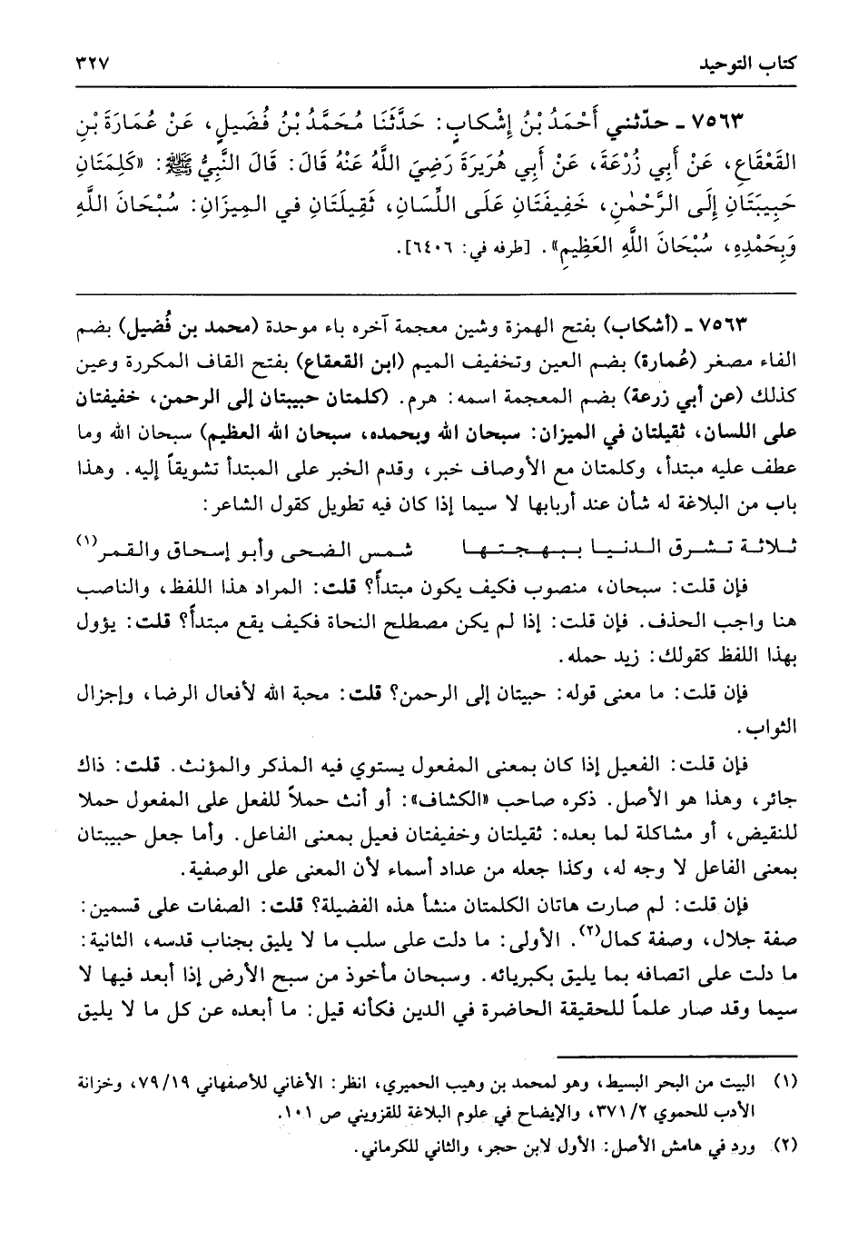 7563 - (أشكاب) بفتح الهمزة وشين معجمة آخره باء موحدة (محمد بن فُضيل) بضم الفاء مصغر (عُمارة) بضم العين وتخفيف الميم (ابن القعقاع) بفتح القاف المكررة وعين كذلك (عن أبي زرعة) بضم المعجمة اسمه: هرم. (كلمتان حبيبتان إلى الرحمن، خفيفتان على اللسان، ثقيلتان في الميزان: سبحان الله وبحمده، سبحان الله العظيم) سبحان الله وما عطف عليه مبتدأ، وكلمتان مع الأوصاف خبر، وقدم الخبر على المبتدأ تشويقًا إليه. وهذا باب من البلاغة له شأن عند أربابها لا سيما إذا كان فيه تطويل كقول الشاعر: