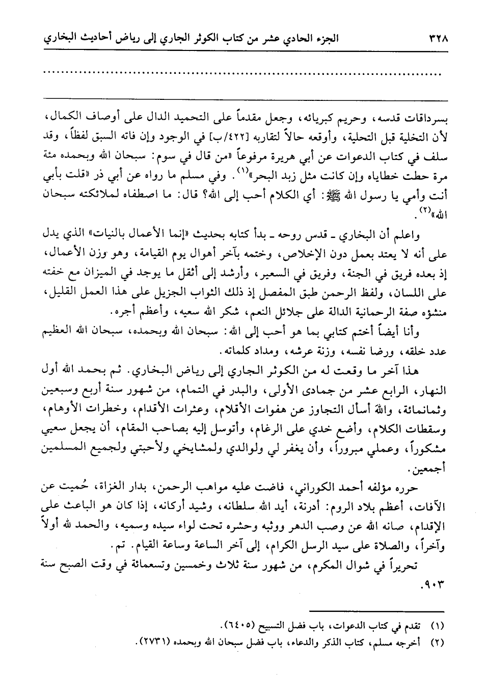 هذا آخر ما وقعت له من الكوثر الجاري إلى رياض البخاري. ثم بحمد الله أول النهار، الرابع عشر من جمادى الأولى، والبدر في التمام، من شهور سنة أربع وسبعين وثمانمائة، واللهَ أسأل التجاوز عن هفوات الأقلام، وعثرات الأقدام، وخطرات الأوهام، وسقطات الكلام، وأضع خدي على الرغام، وأتوسل إليه بصاحب المقام، أن يجعل سعيي مشكورًا، وعملي مبرورًا، وأن يغفر لي ولوالدي ولمشايخي ولأحبتي ولجميع المسلمين أجمعين.