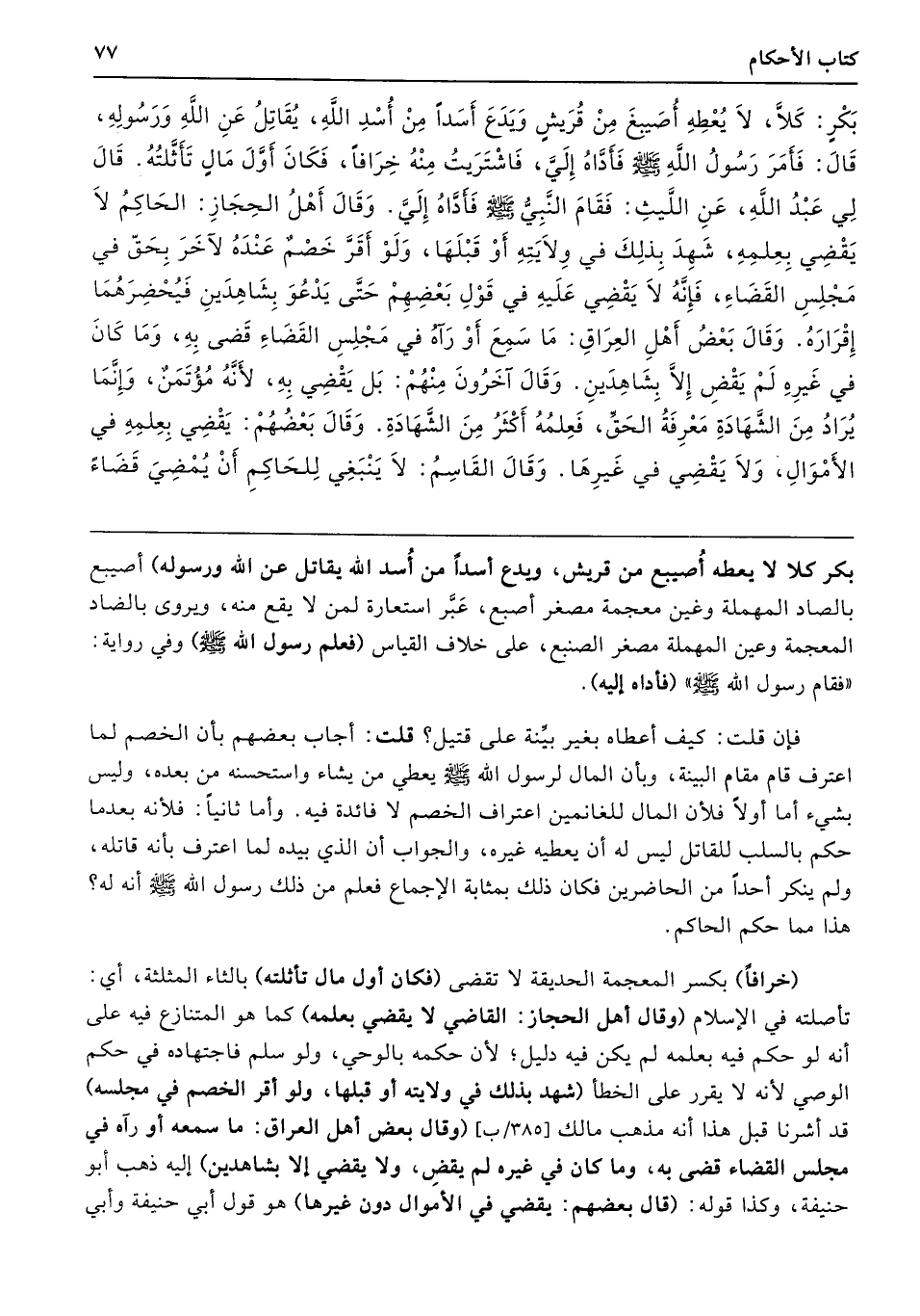 بَكْرٍ كَلاَّ لاَ يُعْطِهِ أُصَيْبِغَ مِنْ قُرَيْشٍ وَيَدَعَ أَسَدًا مِنْ أُسْدِ اللَّهِ يُقَاتِلُ عَنِ اللَّهِ وَرَسُولِهِ. قَالَ فَأَمَرَ رَسُولُ اللَّهِ - صلى الله عليه وسلم - فَأَدَّاهُ إِلَىَّ فَاشْتَرَيْتُ مِنْهُ خِرَافًا فَكَانَ أَوَّلَ مَالٍ تَأَثَّلْتُهُ. قَالَ لِى عَبْدُ اللَّهِ عَنِ اللَّيْثِ فَقَامَ النَّبِىُّ - صلى الله عليه وسلم - فَأَدَّاهُ إِلَىَّ. وَقَالَ أَهْلُ الْحِجَازِ الْحَاكِمُ لاَ يَقْضِى بِعِلْمِهِ، شَهِدَ بِذَلِكَ فِي وِلاَيَتِهِ أَوْ قَبْلَهَا. وَلَوْ أَقَرَّ خَصْمٌ عِنْدَهُ لآخَرَ بِحَقٍّ فِي مَجْلِسِ الْقَضَاءِ، فَإِنَّهُ لاَ يَقْضِى عَلَيْهِ فِي قَوْلِ بَعْضِهِمْ، حَتَّى يَدْعُوَ بِشَاهِدَيْنِ فَيُحْضِرَهُمَا إِقْرَارَهُ. وَقَالَ بَعْضُ أَهْلِ الْعِرَاقِ مَا سَمِعَ أَوْ رَآهُ فِي مَجْلِسِ الْقَضَاءِ قَضَى بِهِ، وَمَا كَانَ فِي غَيْرِهِ لَمْ يَقْضِ إِلاَّ بِشَاهِدَيْنِ. وَقَالَ آخَرُونَ مِنْهُمْ بَلْ يَقْضِى بِهِ، لأَنَّهُ مُؤْتَمَنٌ، وَإِنَّمَا يُرَادُ مِنَ الشَّهَادَةِ مَعْرِفَةُ الْحَقِّ، فَعِلْمُهُ أَكْثَرُ مِنَ الشَّهَادَةِ. وَقَالَ بَعْضُهُمْ يَقْضِى بِعِلْمِهِ فِي الأَمْوَالِ، وَلاَ يَقْضِى فِي غَيْرِهَا. وَقَالَ الْقَاسِمُ لاَ يَنْبَغِى لِلْحَاكِمِ أَنْ يُمْضِىَ قَضَاءً