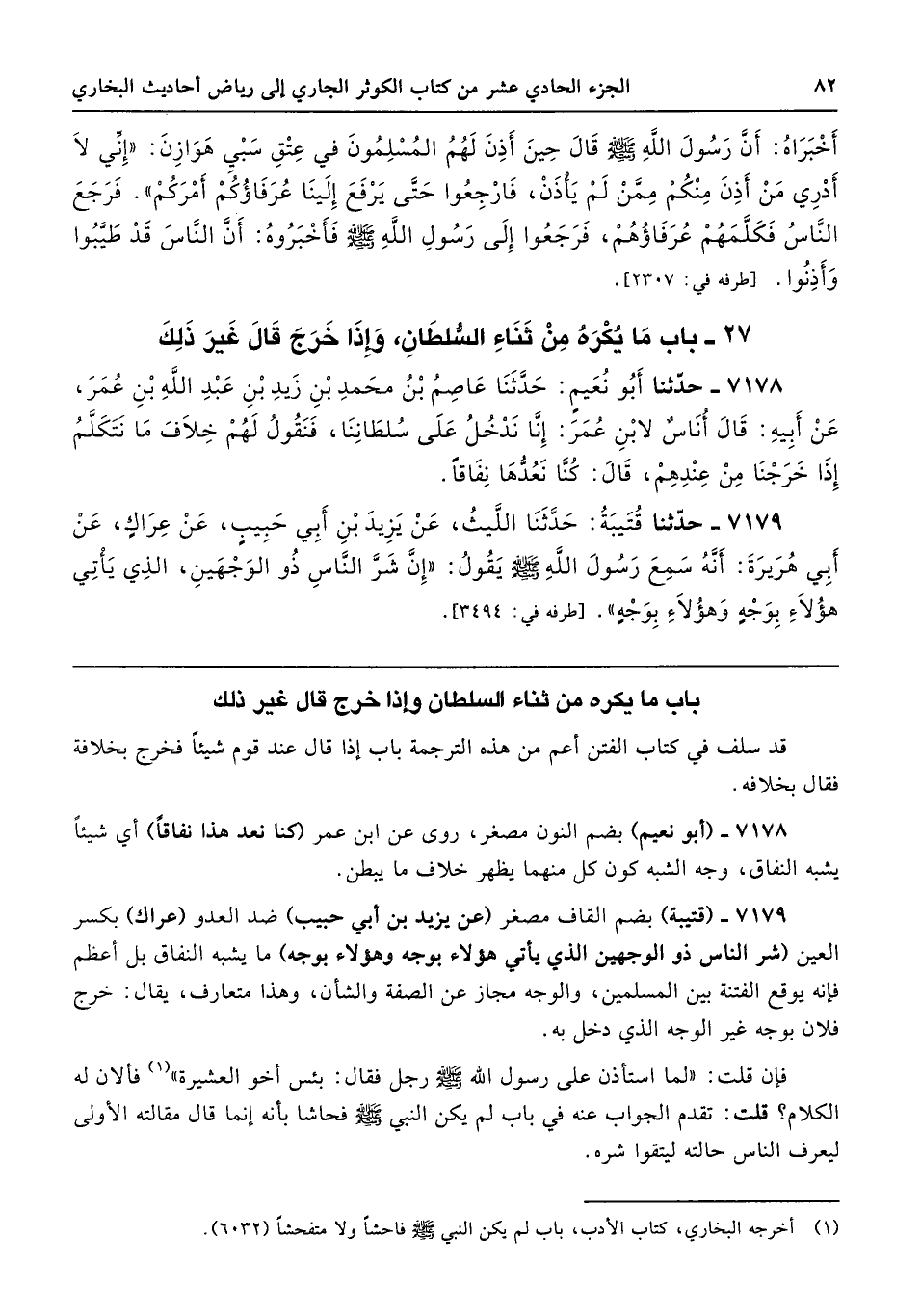 فان قلت: "لما استأذن على رسول الله - صلى الله عليه وسلم - رجل فقال: بئس أخو العشيرة" فألان له الكلام؟ قلت: تقدم الجواب عنه في باب لم يكن النَّبِيّ -صلى الله عليه وسلم- فحاشا بأنه إنما قال مقالته الأولى ليعرف الناس حالته ليتقوا شره.
