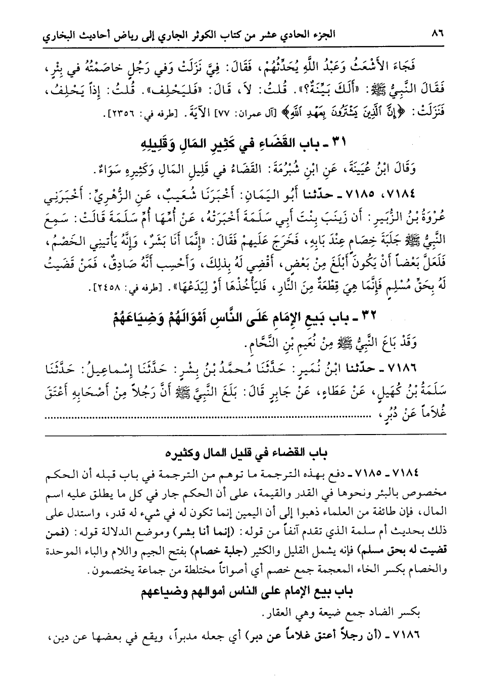 7184 - 7185 - دفع بهذه الترجمة ما توهم من الترجمة في باب قبله أن الحكم مخصوص بالبئر ونحوها في القدر والقيمة، على أن الحكم جار في كل ما يطلق عليه اسم المال، فإن طائفة من العلماء ذهبوا إلى أن اليمين إنما تكون له في شيء له قدر، واستدل على ذلك بحديث أم سلمة الذي تقدم آنفًا من قوله: (إنما أنا بشر) وموضع الدلالة قوله: (فمن قضيت له بحق مسلم) فإنَّه يشمل القليل والكثير (جلبة خصام) بفتح الجيم والسلام والباء الموحدة والخصام بكسر الخاء المعجمة جمع خصم أي أصواتًا مختلطة من جماعة يختصمون.