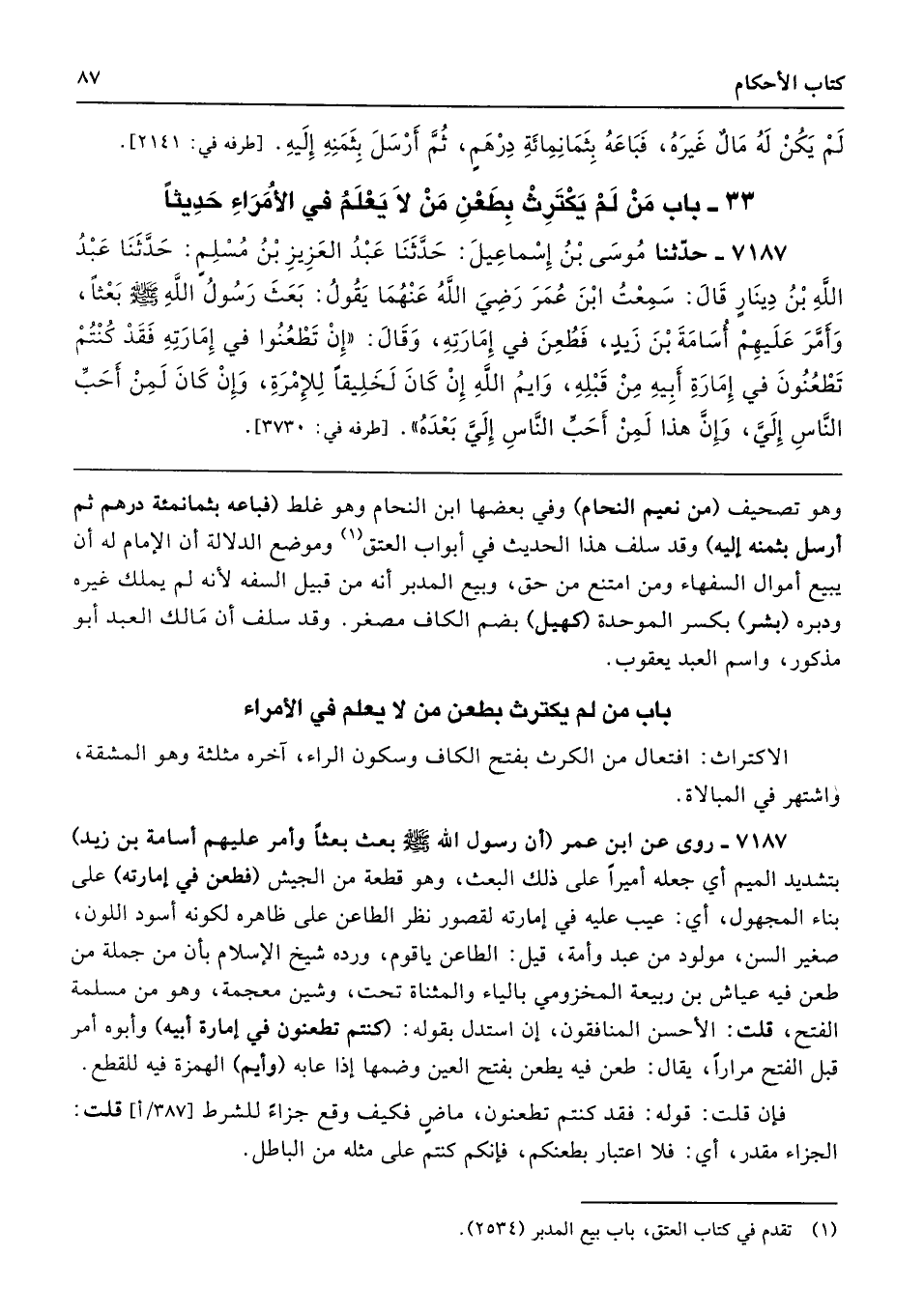 7187 - روى عن ابن عمر (أن رسول الله - صلى الله عليه وسلم - بعث بعثًا وأمر عليهم أسامة بن زيد) بتشديد الميم أي جعله أميرًا على ذلك البعث، وهو قطعة من الجيش (فطعن في إمارته) على بناء المجهول، أي: عيب عليه في إمارته لقصور نظر الطاعن علي ظاهره لكونه أسود اللون، صغير السن, مولود من عبد وأمة، قيل: الطاعن ياقوم، ورده شيخ الإِسلام بأن من جملة من طعن فيه عياش بن ربيعة المخزومي بالياء والمثناة تحت، وستين معجمة، وهو من مسلمة الفتح، قلت: الأحسن المنافقون، إن استدل بقوله: (كنتم تطعنون في إمارة أَبيه) وأبوه أمر قبل الفتح مرارًا، يقال: طعن فيه يطعن بفتح العين وضمها إذا عابه (وأيم) الهمزة فيه للقطع.