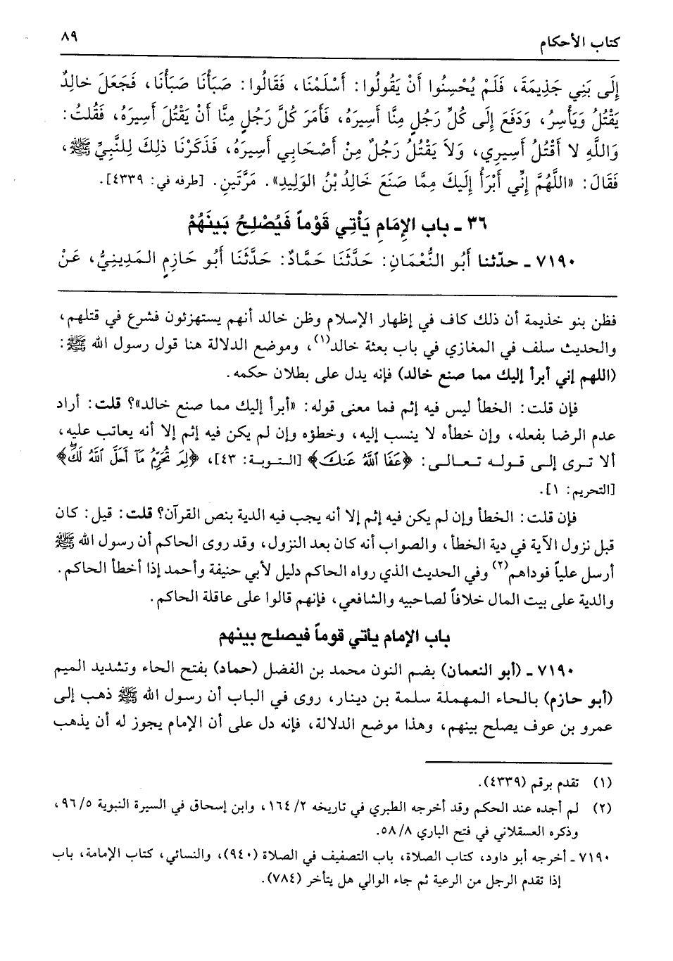 7190 - (أبو النُّعمان) بضم النُّون محمَّد بن الفضل (حماد) بفتح الحاء وتشديد الميم (أبو حازم) بالحاء المهملة سلمة بن دينار، روى في الباب أن رسول الله - صلى الله عليه وسلم - ذهب إلى عمرو بن عوف يصلح بينهم، وهذا موضع الدلالة، فإنَّه دل على أن الإِمام يجوز له أن يذهب