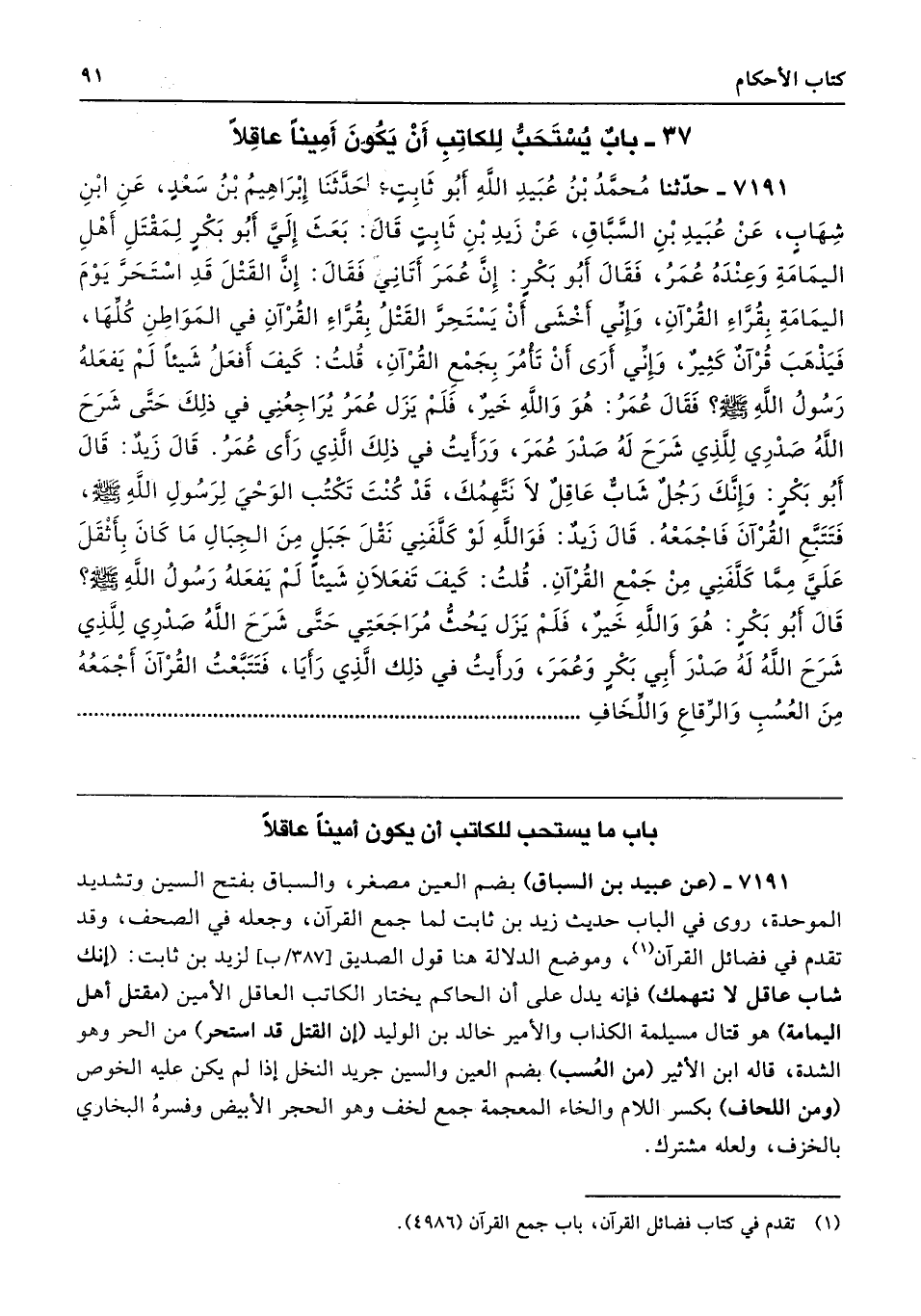 7191 - (عن عبيد بن السباق) بضم العين مصغر، والسباق بفتح السين وتشديد الموحدة، روى في الباب حديث زيد بن ثابت لما جمع القرآن، وجعله في الصحف، وقد تقدم في فضائل القرآن، وموضع الدلالة هنا قول الصديق لزيد بن ثابت: (إنك شاب عاقل لا نتهمك) فإنَّه يدل على أن الحاكم يختار الكاتب العاقل الأمين (مقتل أهل اليمامة) هو قتال مسيلمة الكذاب والأمير خالد بن الوليد (إن القتل قد استحر) من الحر وهو الشدة، قاله ابن الأثير (من العُسب) بضم العين والسين جريد النخل إذا لم يكن عليه الخوص (ومن اللحاف) بكسر اللام والخاء المعجمة جمع لخف وهو الحجر الأبيض وفسرهُ البُخَارِيّ بالخزف، ولعله مشترك.