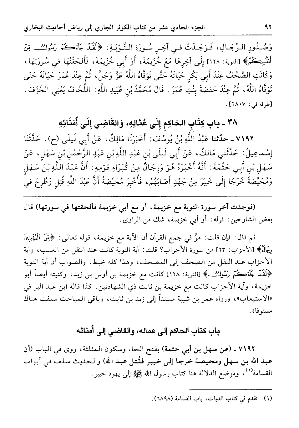 7192 - (عن سهل بن أبي حثمة) بفتح الحاء وسكون المثلثة، روى في الباب (أن عبد الله بن سهل ومحيصة خرجا أبي خيبر فقُتل عبد الله) والحديث سلف في أبواب القسامة، وموضع الدلالة هنا كتاب رسول الله -صلى الله عليه وسلم- إلى يهود خيبر.