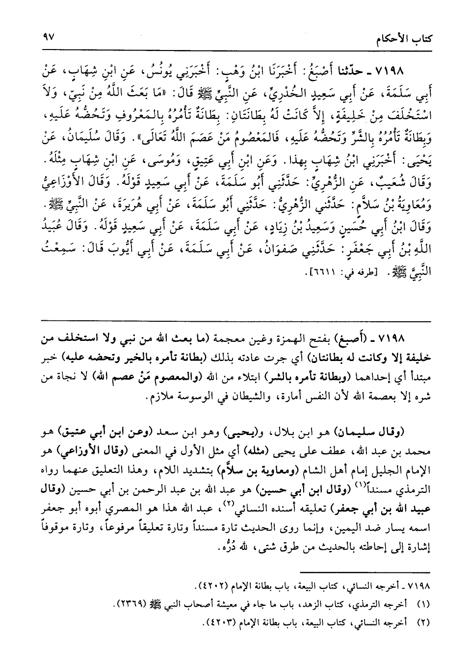 7198 - حَدَّثَنَا أَصْبَغُ أَخْبَرَنَا ابْنُ وَهْبٍ أَخْبَرَنِى يُونُسُ عَنِ ابْنِ شِهَابٍ عَنْ أَبِى سَلَمَةَ عَنْ أَبِى سَعِيدٍ الْخُدْرِىِّ عَنِ النَّبِيِّ - صلى الله عليه وسلم - قَالَ «مَا بَعَثَ اللَّهُ مِنْ نَبِىٍّ وَلاَ اسْتَخْلَفَ مِنْ خَلِيفَةٍ، إِلاَّ كَانَتْ لَهُ بِطَانَتَانِ، بِطَانَةٌ تَأْمُرُهُ بِالْمَعْرُوفِ وَتَحُضُّهُ عَلَيْهِ، وَبِطَانَةٌ تَأْمُرُهُ بِالشَّرِّ وَتَحُضُّهُ عَلَيْهِ، فَالْمَعْصُومُ مَنْ عَصَمَ اللَّهُ تَعَالَى». وَقَالَ سُلَيْمَانُ عَنْ يَحْيَى أَخْبَرَنِى ابْنُ شِهَابٍ بِهَذَا، وَعَنِ ابْنِ أَبِى عَتِيقٍ وَمُوسَى عَنِ ابْنِ شِهَابٍ مِثْلَهُ، وَقَالَ شُعَيْبٌ عَنِ الزُّهْرِىِّ حَدَّثَنِى أَبُو سَلَمَةَ عَنْ أَبِى سَعِيدٍ قَوْلَهُ. وَقَالَ الأَوْزَاعِىُّ وَمُعَاوِيَةُ بْنُ سَلاَّمٍ حَدَّثَنِى الزُّهْرِىُّ حَدَّثَنِى أَبُو سَلَمَةَ عَنْ أَبِى هُرَيْرَةَ عَنِ النَّبِيِّ - صلى الله عليه وسلم -. وَقَالَ ابْنُ أَبِى حُسَيْنٍ وَسَعِيدُ بْنُ زِيَادٍ عَنْ أَبِى سَلَمَةَ عَنْ أَبِى سَعِيدٍ قَوْلَهُ. وَقَالَ عُبَيْدُ اللَّهِ بْنُ أَبِى جَعْفَرٍ حَدَّثَنِى صَفْوَانُ عَنْ أَبِى سَلَمَةَ عَنْ أَبِى أَيُّوبَ قَالَ سَمِعْتُ النَّبِىَّ - صلى الله عليه وسلم -. طرفه 6611