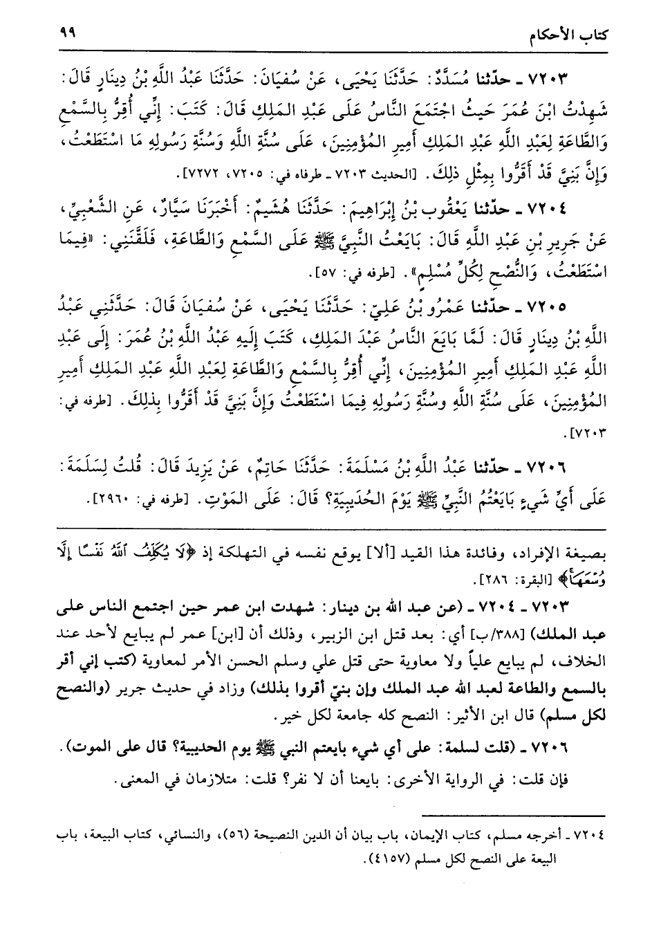 7203 - 7204 - (عن عبد الله بن دينار: شهدت ابن عمر حين اجتمع النَّاس على عبد الملك) أي: بعد قتل ابن الزُّبير، وذلك أن [ابن] عمر لم يبايع لأحد عند الخلاف، لم يبايع عليًّا ولا معاوية حتَّى قتل علي وسلم الحسن الأمر لمعاوية (كتب إني أقر بالسمع والطاعة لعبد الله عبد الملك وإن بنيّ أقروا بذلك) وزاد في حديث جرير (والنصح لكل مسلم) قال ابن الأثير: النصح كله جامعة لكل خير.