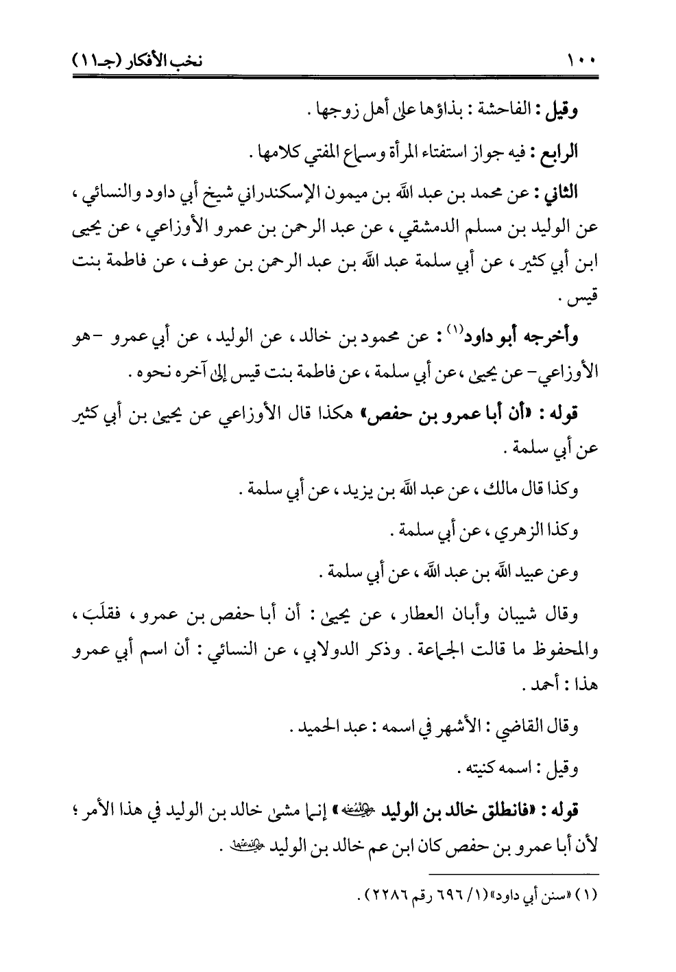 وأخرجه أبو داود (¬1): عن محمود بن خالد، عن الوليد، عن أبي عمرو -هو الأوزاعي- عن يحيى، عن أبي سلمة، عن فاطمة بنت قيس إلى آخره نحوه.
