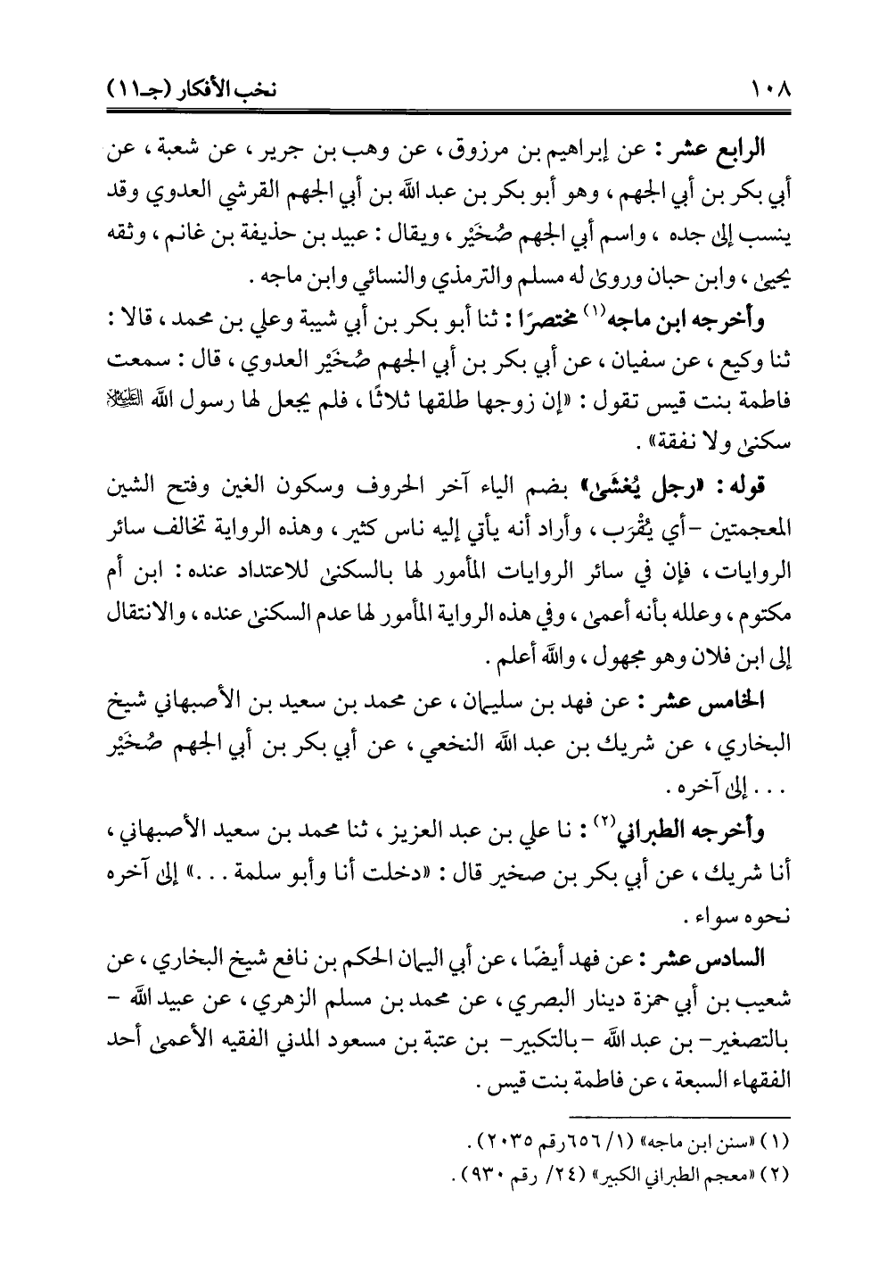 وأخرجه ابن ماجه (¬1) مختصرًا: ثنا أبو بكر بن أبي شيبة وعلي بن محمد، قالا: ثنا وكيع، عن سفيان، عن أبي بكر بن أبي الجهم صُخَيْر العدوي، قال: سمعت فاطمة بنت قيس تقول: "إن زوجها طلقها ثلاثًا، فلم يجعل لها رسول الله -عليه السلام- سكنى ولا نفقة".