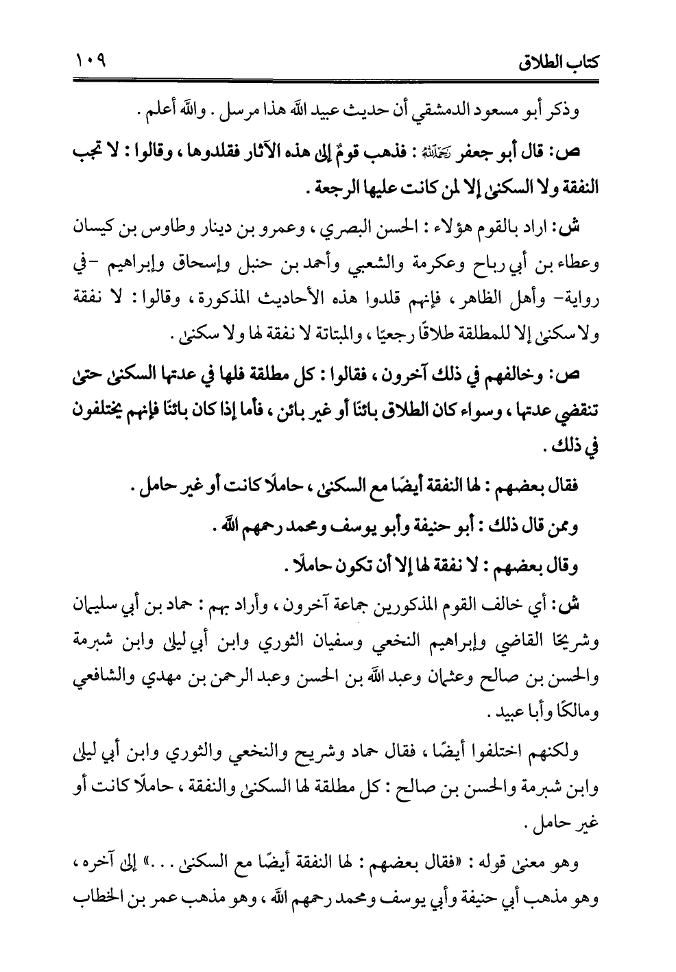 ش: أي خالف القوم المذكورين جماعة آخرون، وأراد بهم: حماد بن أبي سليمان وشريحًا القاضي وإبراهيم النخعي وسفيان الثوري وابن أبي ليلى وابن شبرمة والحسن بن صالح وعثمان وعبد الله بن الحسن وعبد الرحمن بن مهدي والشافعي ومالكًا وأبا عبيد.