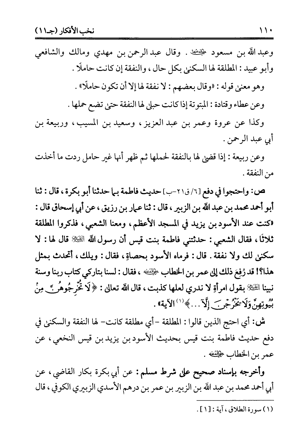 ش: أي احتج الذين قالوا: المطلقة -أي مطلقة كانت- لها النفقة والسكنى في دفع حديث فاطمة بنت قيس بحديث الأسود بن يزيد بن قيس النخعي، عن عمر بن الخطاب -رضي الله عنه-.