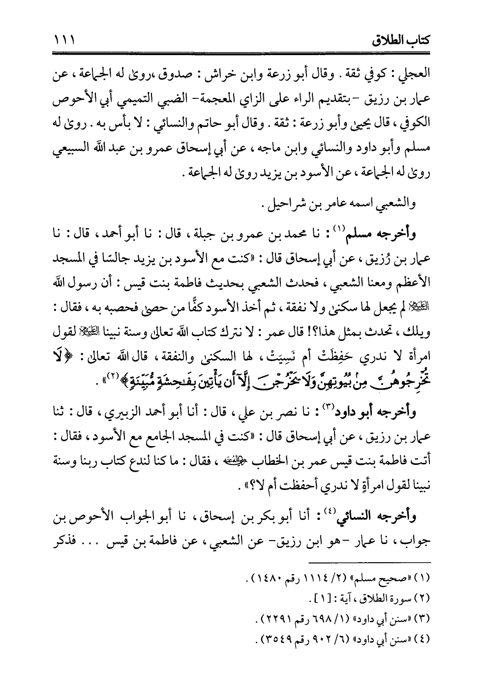 وأخرجه أبو داود (¬3): نا نصر بن علي، قال: أنا أبو أحمد الزبيري، قال: ثنا عمار بن رزيق، عن أبي إسحاق قال: "كنت في المسجد الجامع مع الأسود، فقال: أتت فاطمة بنت قيس عمر بن الخطاب -رضي الله عنه-، فقال: ما كنا لندع كتاب ربنا وسنة نبينا لقول امرأةٍ لا ندري أحفظت أم لا؟ ".