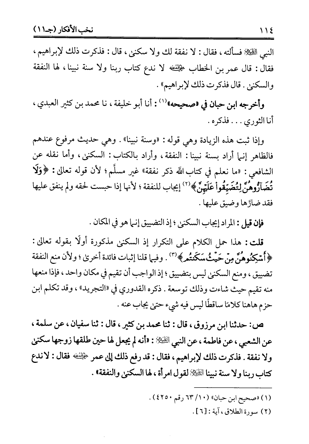 النبي -عليه السلام- فسألته، فقال: لا نفقة لك ولا سكنى، قال: فذكرت ذلك لإبراهيم، فقال: قال عمر بن الخطاب -رضي الله عنه- لا ندع كتاب ربنا ولا سنة نبينا، لها النفقة والسكنى. قال فذكرت ذلك لإبراهيم".
