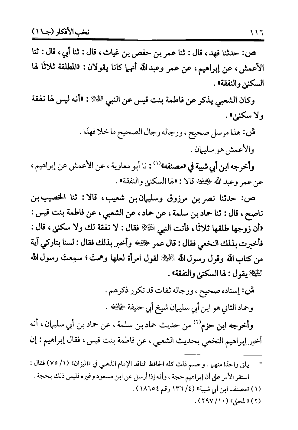 وأخرجه ابن حزم (¬2) من حديث حماد بن سلمة، عن حماد بن أبي سليمان، أنه أخبر إبراهيم النخعي بحديث الشعبي، عن فاطمة بنت قيس، فقال إبراهيم: إن
