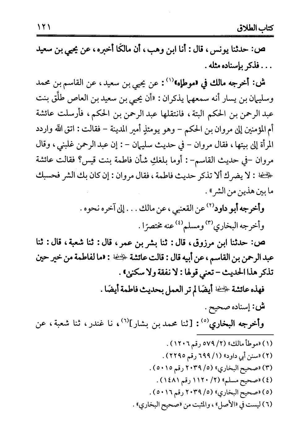 ش: أخرجه مالك في "موطإه" (¬1): عن يحيى بن سعيد، عن القاسم بن محمد وسليمان بن يسار أنه سمعهما يذكران: "أن يحيى بن سعيد بن العاص طلَّق بنت عبد الرحمن بن الحكم البتة، فانتقلها عبد الرحمن بن الحكم، فأرسلت عائشة أم المؤمنين إلى مروان بن الحكم -وهو يومئذٍ أمير المدينة- فقالت: اتق الله واردد المرأة إلى بيتها، فقال مروان -في حديث سليمان-: إن عبد الرحمن غلبني، وقال مروان -في حديث القاسم-: أو ما بلغكِ شأن فاطمة بنت قيس؟ فقالت عائشة -رضي الله عنها-: لا يضرك ألا تذكر حديث فاطمة، فقال مروان: إن كان بك الشر فحسبك ما بين هذين من الشر".