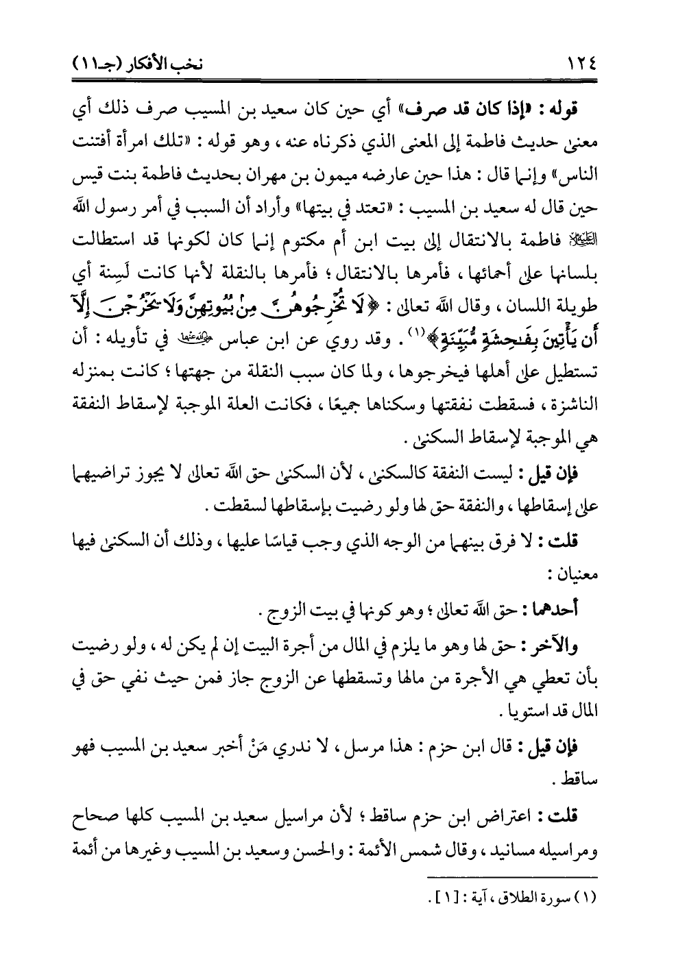 قوله: "إذا كان قد صرف" أي حين كان سعيد بن المسيب صرف ذلك أي معنى حديث فاطمة إلى المعنى الذي ذكرناه عنه، وهو قوله: "تلك امرأة أفتنت الناس" وإنما قال: هذا حين عارضه ميمون بن مهران بحديث فاطمة بنت قيس حين قال له سعيد بن المسيب: "تعتد في بيتها" وأراد أن السبب في أمر رسول الله -عليه السلام- فاطمة بالانتقال إلى بيت ابن أم مكتوم إنما كان لكونها قد استطالت بلسانها على أحمائها، فأمرها بالانتقال؛ فأمرها بالنقلة لأنها كانت لَسِنة أي طويلة اللسان، وقال الله تعالى: {لَا تُخْرِجُوهُنَّ مِنْ بُيُوتِهِنَّ وَلَا يَخْرُجْنَ إِلَّا أَنْ يَأْتِينَ بِفَاحِشَةٍ مُبَيِّنَةٍ} (¬1). وقد روي عن ابن عباس -رضي الله عنه- في تأويله: أن تستطيل على أهلها فيخرجوها، ولما كان سبب النقلة من جهتها؛ كانت بمنزله الناشزة، فسقطت نفقتها وسكناها جميعًا، فكانت العلة الموجبة لإسقاط النفقة هي الموجبة لإسقاط السكنى.