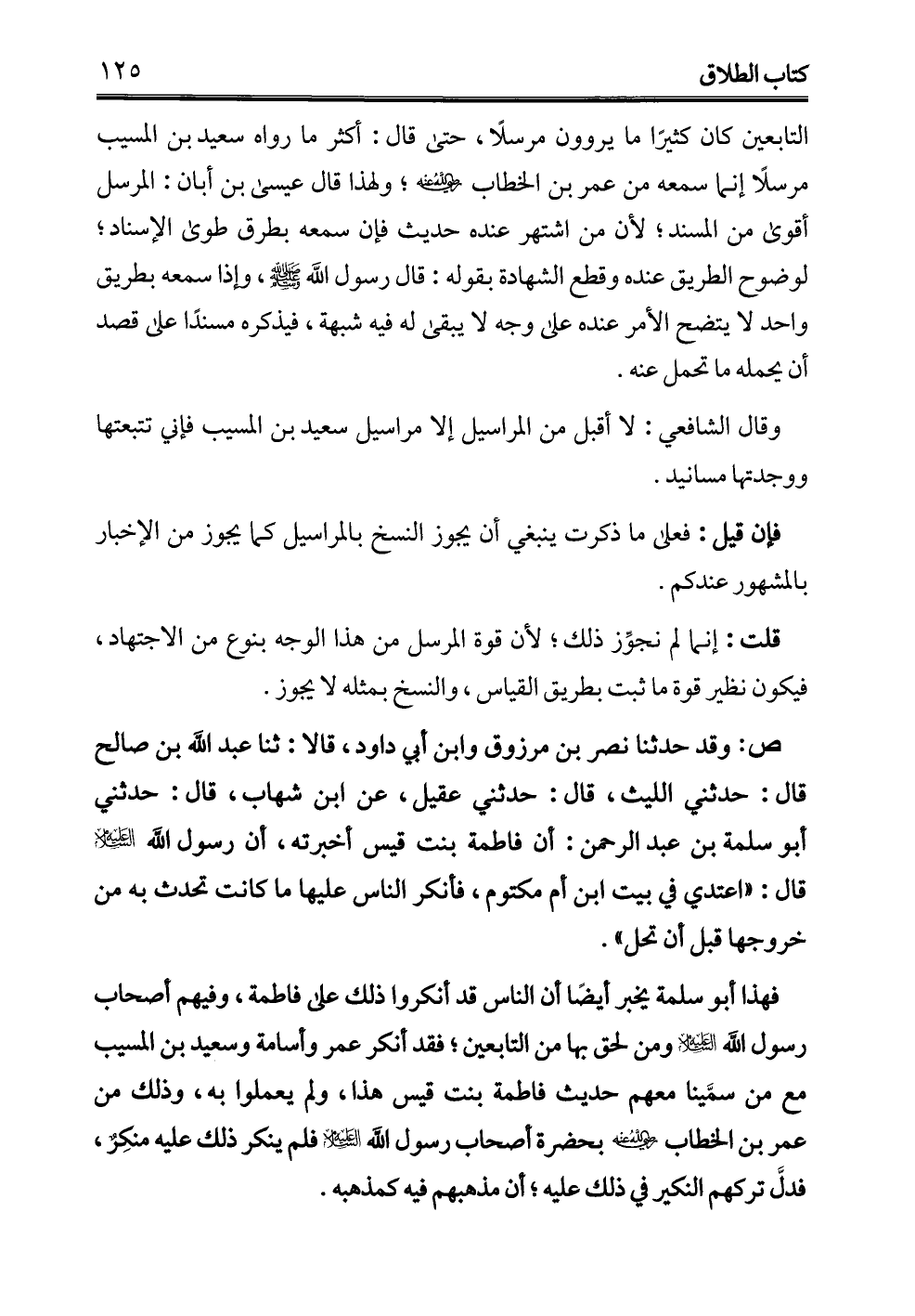 فهذا أبو سلمة يخبر أيضًا أن الناس قد أنكروا ذلك على فاطمة، وفيهم أصحاب رسول الله -عليه السلام- ومن لحق بها من التابعين؛ فقد أنكر عمر وأسامة وسعيد بن المسيب مع من سمَّينا معهم حديث فاطمة بنت قيس هذا، ولم يعملوا به، وذلك من عمر بن الخطاب -رضي الله عنه- بحضرة أصحاب رسول الله -عليه السلام- فلم ينكر ذلك عليه منكِرٌ، فدلَّ تركهم النكير في ذلك عليه؛ أن مذهبهم فيه كمذهبه.