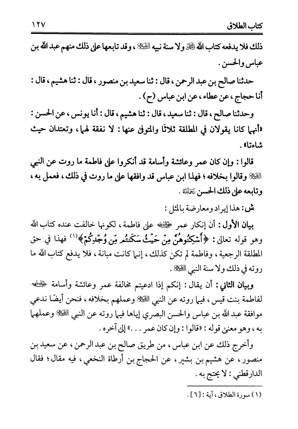قالوا: وإن كان عمر وعائشة وأسامة قد أنكروا على فاطمة ما روت عن النبي -عليه السلام- وقالوا بخلافه؛ فهذا ابن عباس قد وافقها على ما روت في ذلك، فعمل به، وتابعه على ذلك الحسن -رحمه الله-.
