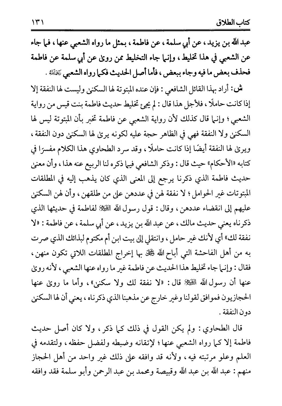 قال الطحاوي: ولم يكن القول في ذلك كما ذكر، ولا كان أصل حديث فاطمة إلا كما رواه الشعبي عنها؛ لإتقانه وضبطه ولفضل حفظه، ولتقدمه في العلم وعلو مرتبته فيه، ولأنه قد وافقه على ذلك غير واحد من أهل الحجاز منهم: عبد الله بن عبد الله وقبيصة ومحمد بن عبد الرحمن وأبو سلمة فقد وافقه