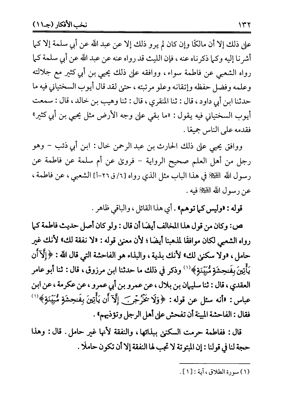 ص: وكان من قول هذا المخالف أيضًا أن قال: ولو كان أصل حديث فاطمة كما رواه الشعبي لكان موافقًا لمذهبنا أيضًا؛ لأن معنى قوله: "لا نفقة لك" لأنك غير حامل، "ولا سكنى لك" لأنك بذية، والبذاء هو الفاحشة التي قال الله: {إِلَّا أَنْ يَأْتِينَ بِفَاحِشَةٍ مُبَيِّنَةٍ} (¬1) وذكر في ذلك ما حدثنا ابن مرزوق، قال: ثنا أبو عامر العقدي، قال: ثنا سليمان بن بلال، عن عمرو بن أبي عمرو، عن عكرمة، عن ابن عباس: "أنه سئل عن قوله: {وَلَا يَخْرُجْنَ إِلَّا أَنْ يَأْتِينَ بِفَاحِشَةٍ مُبَيِّنَةٍ} (1) فقال: الفاحشة المبينة أن تفحش على أهل الرجل وتؤذيهم".