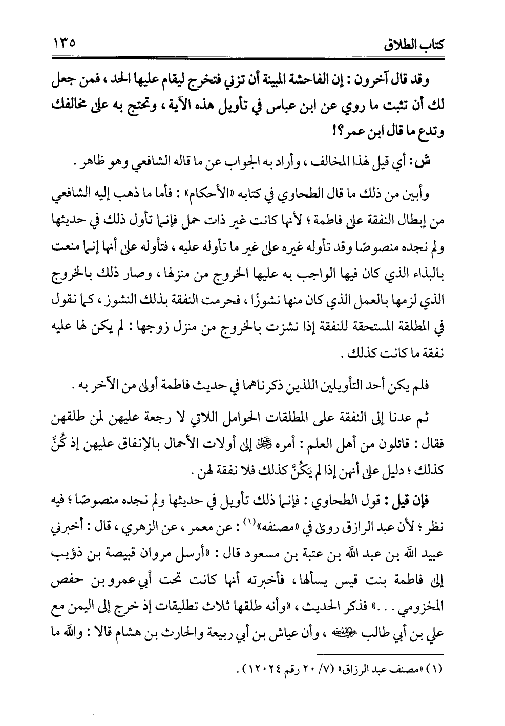وأبين من ذلك ما قال الطحاوي في كتابه "الأحكام": فأما ما ذهب إليه الشافعي من إبطال النفقة على فاطمة؛ لأنها كانت غير ذات حمل فإنما تأول ذلك في حديثها ولم نجده منصوصًا وقد تأوله غيره على غير ما تأوله عليه، فتأوله على أنها إنما منعت بالبذاء الذي كان فيها الواجب به عليها الخروج من منزلها، وصار ذلك بالخروج الذي لزمها بالعمل الذي كان منها نشوزًا، فحرمت النفقة بذلك النشوز، كما نقول في المطلقة المستحقة للنفقة إذا نشزت بالخروج من منزل زوجها: لم يكن لها عليه نفقة ما كانت كذلك.