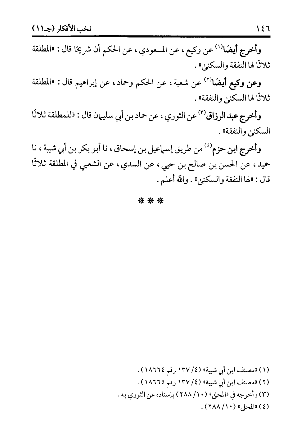 وأخرج ابن حزم (¬4) من طريق إسماعيل بن إسحاق، نا أبو بكر بن أبي شيبة، نا حميد، عن الحسن بن صالح بن حيي، عن السدي، عن الشعبي في المطلقة ثلاثًا قال: "لها النفقة والسكنى". والله أعلم.
