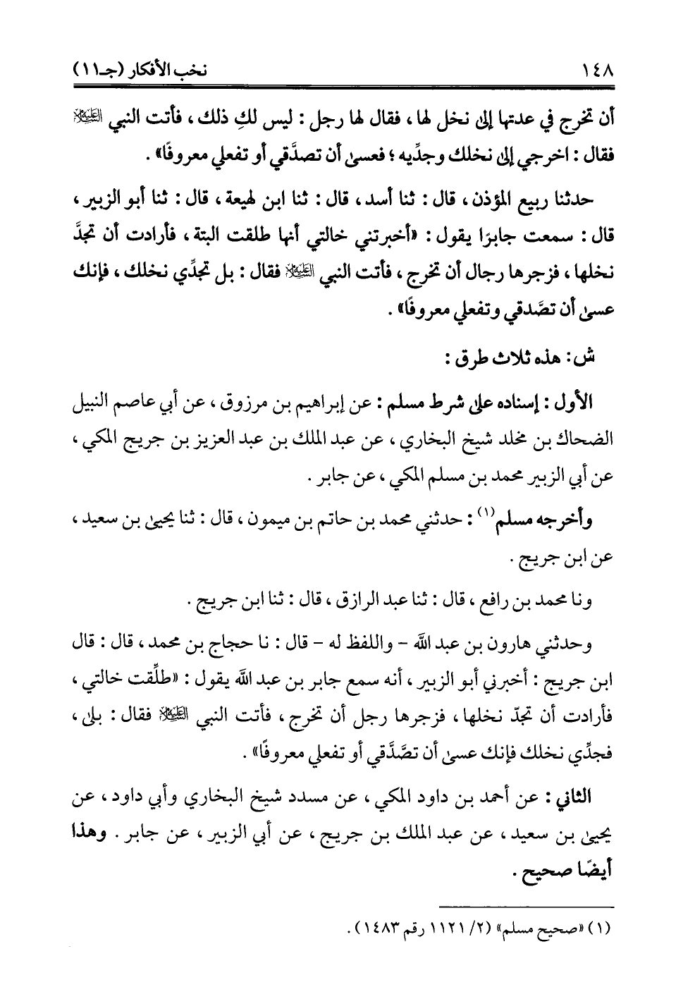 وحدثني هارون بن عبد الله -واللفظ له- قال: نا حجاج بن محمد، قال: قال ابن جريج: أخبرني أبو الزبير، أنه سمع جابر بن عبد الله يقول: "طلِّقت خالتي، فأرادت أن تجدّ نخلها، فزجرها رجل أن تخرج، فأتت النبي -عليه السلام- فقال: بلى، فجدِّي نخلك فإنك عسى أن تصَّدَّقي أو تفعلي معروفًا".