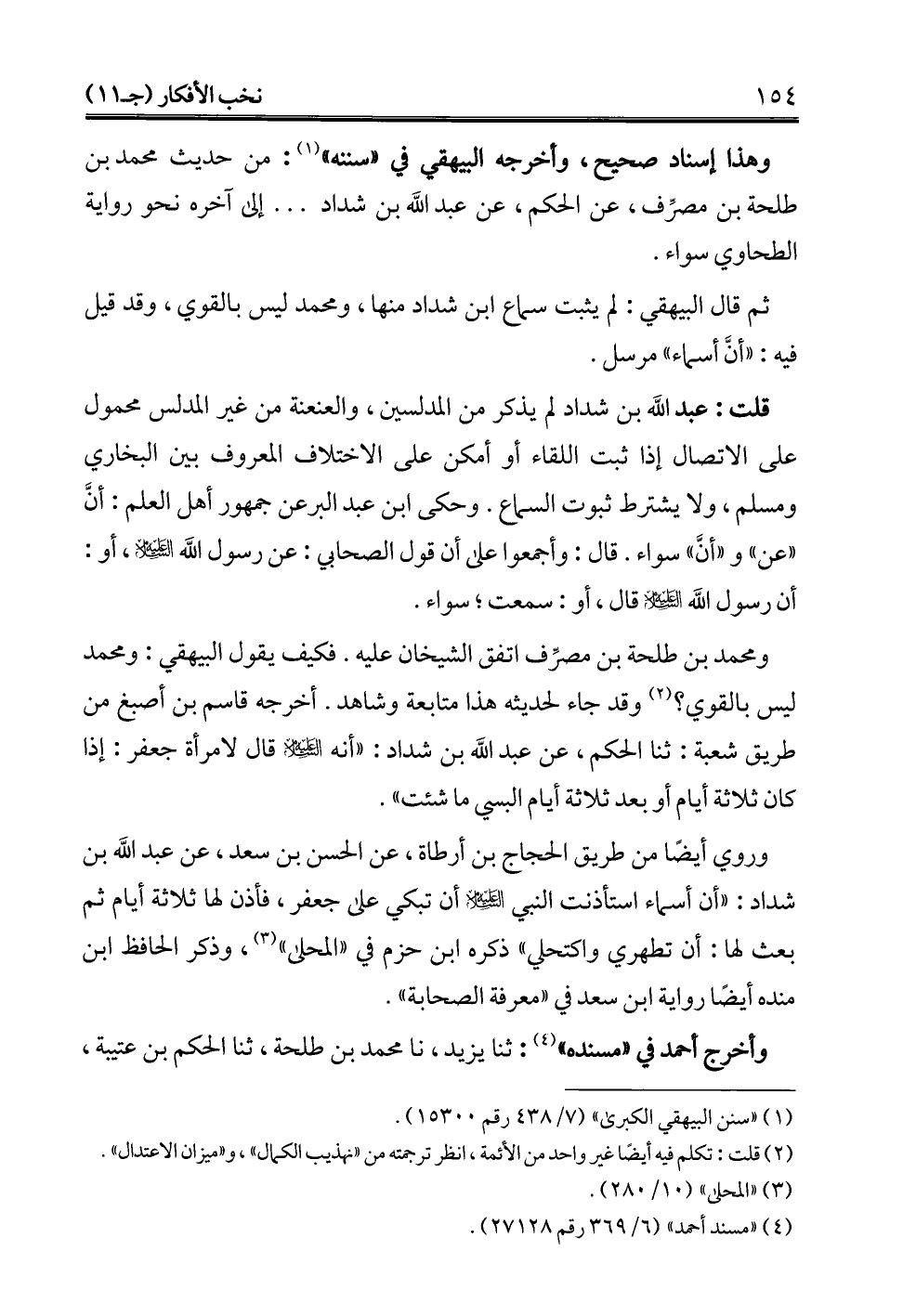 ومحمد بن طلحة بن مصرِّف اتفق الشيخان عليه. فكيف يقول البيهقي: ومحمد ليس بالقوي؟ (¬2) وقد جاء لحديثه هذا متابعة وشاهد. أخرجه قاسم بن أصبغ من طريق شعبة: ثنا الحكم، عن عبد الله بن شداد: "أنه -عليه السلام- قال لامرأة جعفر: إذا كان ثلاثة أيام أو بعد ثلاثة أيام البسي ما شئت".