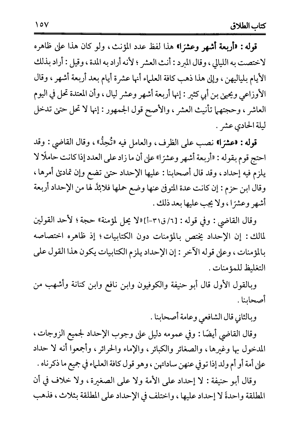 وقال القاضي أيضًا: وفي عمومه دليل على وجوب الإحداد لجميع الزوجات، المدخول بها وغيرها، والصغائر والكبائر، والإماء والحرائر، وأجمعوا أنه لا حداد على أمة أو أم ولد إذا توفي عنهن ساداتهن، وهو قول كافة العلماء في جميع ما ذكرناه.