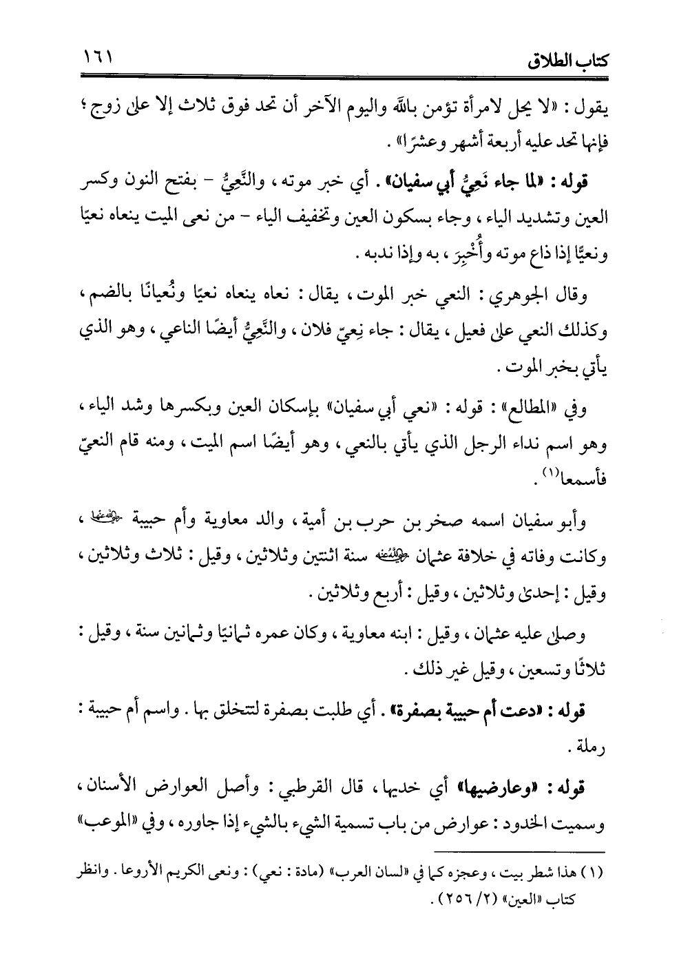 وفي "المطالع": قوله: "نعي أبي سفيان" بإسكان العين وبكسرها وشد الياء، وهو اسم نداء الرجل الذي يأتي بالنعي، وهو أيضًا اسم الميت، ومنه قام النعيّ فأسمعا (¬1).