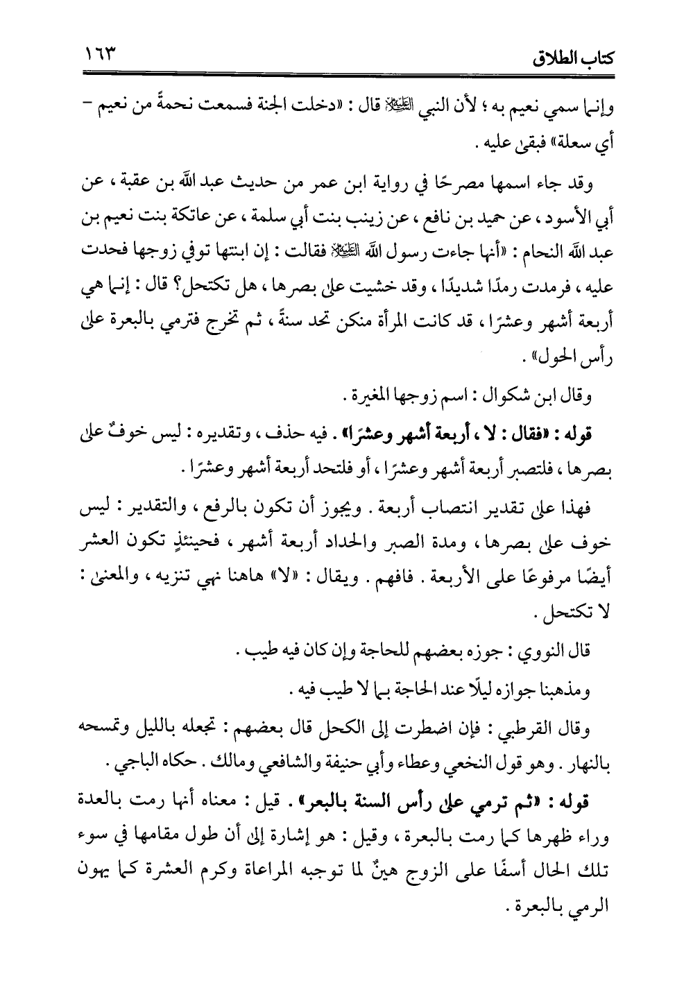 قوله: "فقال: لا، أريعة أشهر وعشرًا". فيه حذف، وتقديره: ليس خوفٌ على بصرها، فلتصبر أربعة أشهر وعشرًا، أو فلتحد أربعة أشهر وعشرًا.