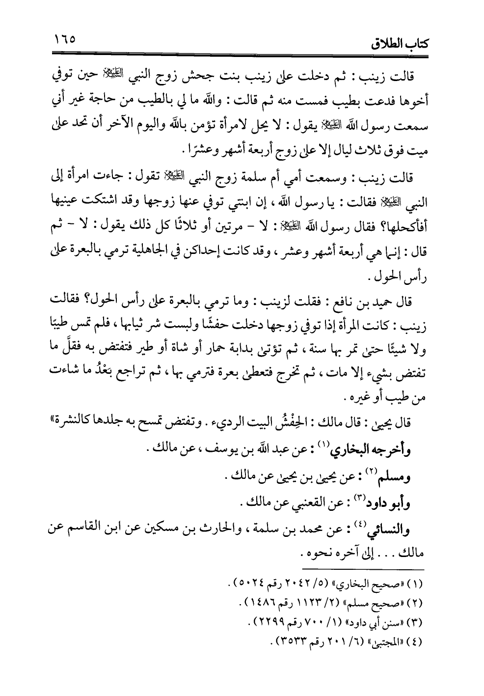 قالت زينب: وسمعت أمي أم سلمة زوج النبي -عليه السلام- تقول: جاءت امرأة إلى النبي -عليه السلام- فقالت: يا رسول الله، إن ابنتي توفي عنها زوجها وقد اشتكت عينيها أفأكحلها؟ فقال رسول الله -عليه السلام-: لا -مرتين أو ثلاثًا كل ذلك يقول: لا- ثم قال: إنما هي أربعة أشهر وعشر، وقد كانت إحداكن في الجاهلية ترمي بالبعرة على رأس الحول.