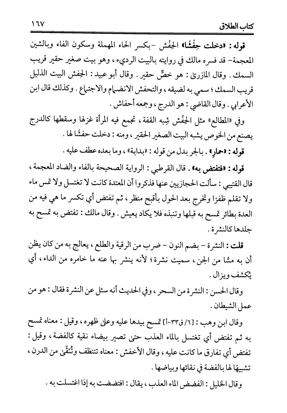 قوله: "فتفتض به". قال القرطبي: الرواية الصحيحة بالفاء والضاد المعجمة، قال القتيبي: سألت الحجازيين عنها فذكروا أن المعتدة كانت لا تغتسل ولا تمس ماء ولا تقلم ظفرًا وتخرج بعد الحول بأقبح منظر، ثم تفتض أي تكسر ما هي فيه من العدة بطائر تمسح به قبلها وتنبذه فلا يكاد يعيش. وقال مالك: تفتض به تمسح به جلدها كالنشرة.