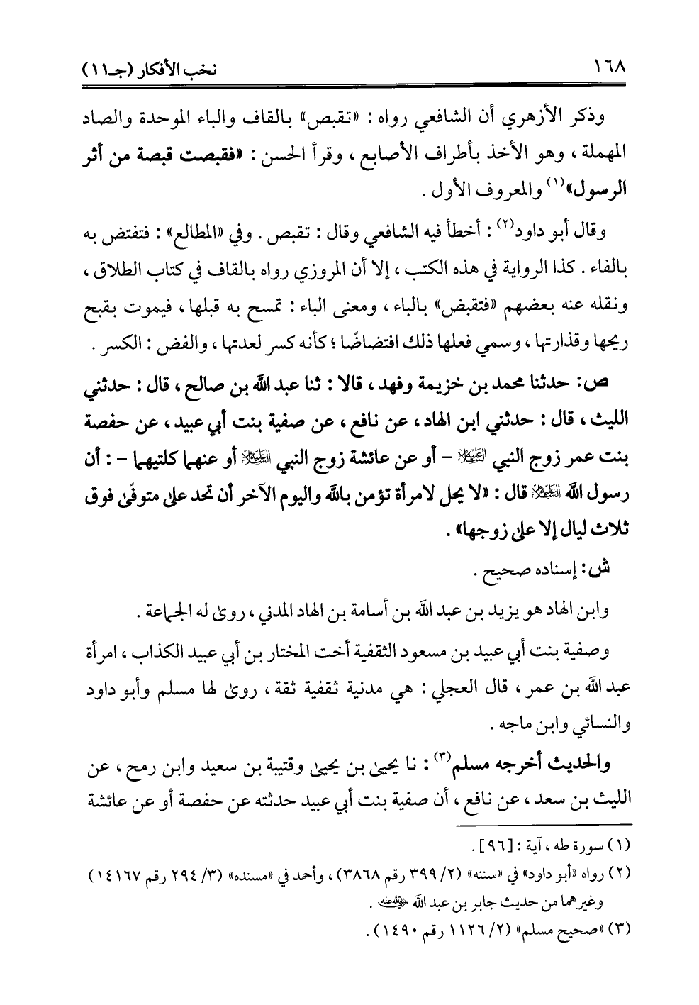 ص: حدثنا محمد بن خزيمة وفهد، قالا: ثنا عبد الله بن صالح، قال: حدثني الليث، قال: حدثني ابن الهاد، عن نافع، عن صفية بنت أبي عبيد، عن حفصة بنت عمر زوج النبي -عليه السلام-أو عن عائشة زوج النبي -عليه السلام- أو عنهما كلتيهما-: أن رسول الله -عليه السلام- قال: "لا يحل لامرأة تؤمن بالله واليوم الآخر أن تحد على متوفًى فوق ثلاث ليال إلا على زوجها".
