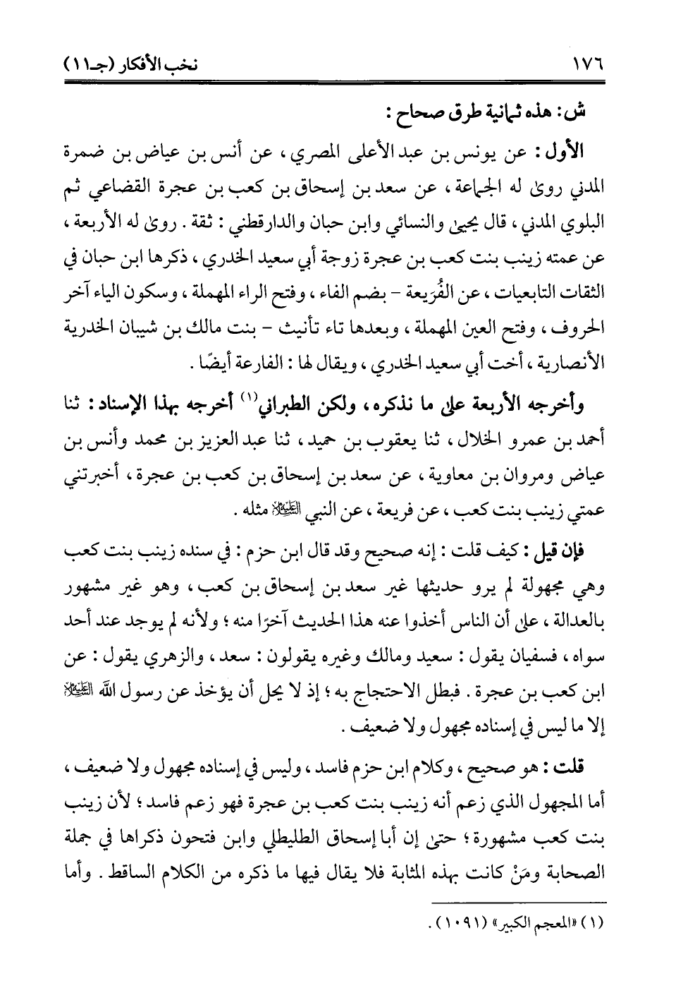 قلت: هو صحيح، وكلام ابن حزم فاسد، وليس في إسناده مجهول ولا ضعيف، أما المجهول الذي زعم أنه زينب بنت كعب بن عجرة فهو زعم فاسد؛ لأن زينب بنت كعب مشهورة؛ حتى إن أبا إسحاق الطليطلي وابن فتحون ذكراها في جملة الصحابة ومَنْ كانت بهذه المثابة فلا يقال فيها ما ذكره من الكلام الساقط. وأما