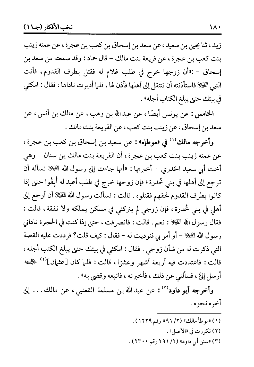 وأخرجه مالك (¬1) في "موطإه": عن سعيد بن إسحاق بن كعب بن عجرة، عن عمته زينب بنت كعب بن عجرة، أن الفريعة بنت مالك بن سنان -وهي أخت أبي سعيد الخدري- أخبرتها: "أنها جاءت إلى رسول الله -عليه السلام- تسأله أن ترجع إلى أهلها في بني خُدرة؛ فإن زوجها خرج في طلب أعبد له أَبِقُوا حتى إذا كانوا بطرف القدوم لحقهم فقتلوه. قالت: فسألت رسول الله -عليه السلام- أن أرجع إلى أهلي في بني خُدرة، فإن زوجي لم يتركني في مسكن يملكه ولا نفقة، قالت: فقال رسول الله -عليه السلام-: نعم. قالت: فانصرفت، حتى إذا كنت في الحجرة ناداني رسول الله -عليه السلام-أو أمر بي فنوديت له- فقال: كيف قلت؟ فرددت عليه القصة التي ذكرت له من شأن زوجي. فقال: امكثي في بيتك حتى يبلغ الكتب أجله، قالت: فاعتددت فيه أربعة أشهر وعشرًا، قالت: فلما كان [عثمان] (¬2) -رضي الله عنه- أرسل إليَّ، فسألني عن ذلك، فأخبرته، فاتبعه وقضى به".