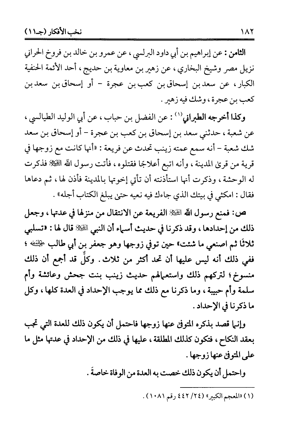 وكذا أخرجه الطبراني (¬1): عن الفضل بن حباب، عن أبي الوليد الطيالسي، عن شعبة، حدثني سعد بن إسحاق بن كعب بن عجرة -أو إسحاق بن سعد شك شعبة- أنه سمع عمته زينب تحدث عن فريعة: "أنها كانت مع زوجها في قرية من قرى المدينة، وأنه أتبع أعلاجًا فقتلوه، فأتت رسول الله -عليه السلام- فذكرت له الوحشة، وذكرت أنها استأذنته أن تأتي إخوتها بالمدينة فأذن لها، ثم دعاها فقال: امكثي في بيتك الذي جاءك فيه نعيه حتى يبلغ الكتاب أجله".