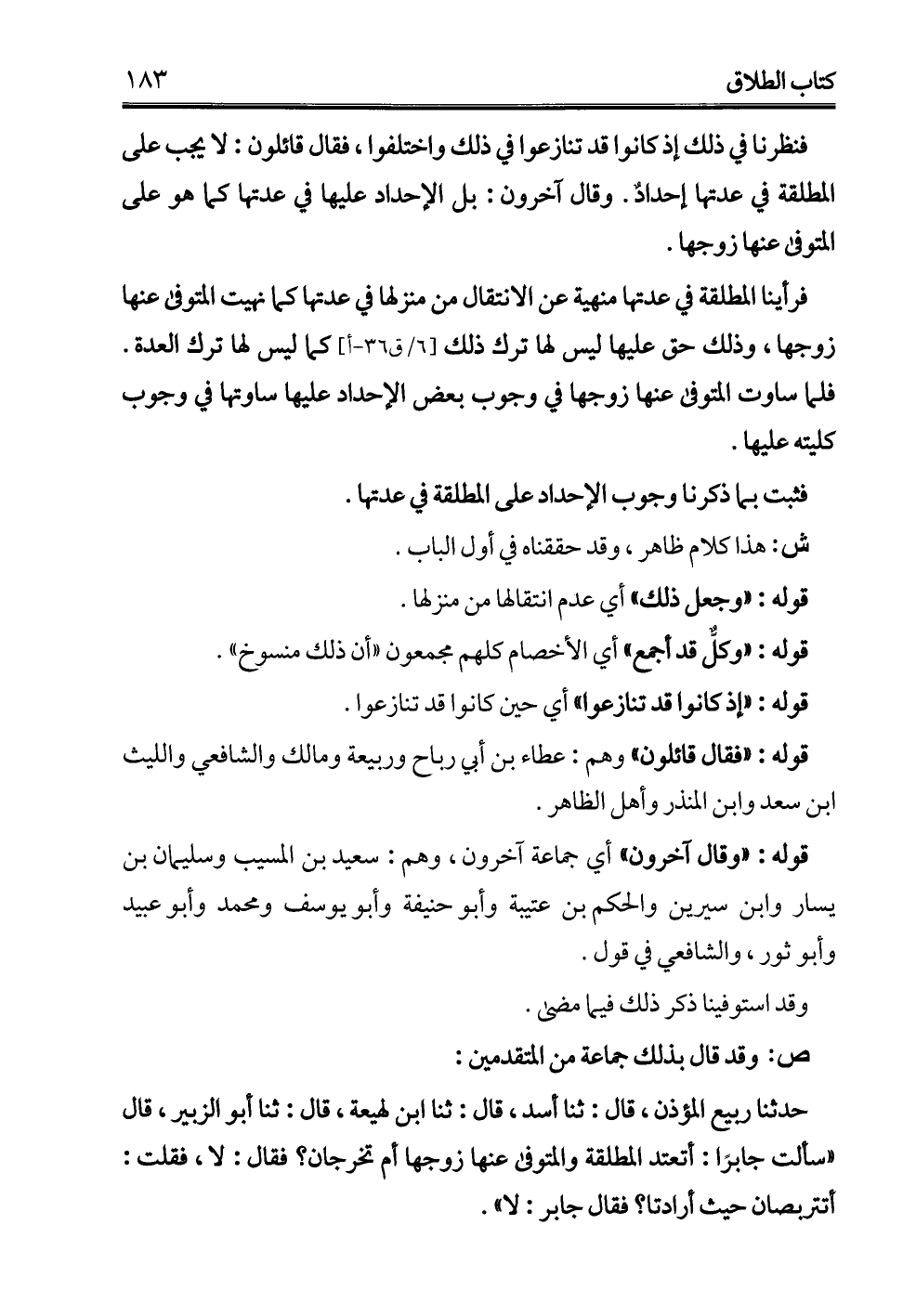 فنظرنا في ذلك إذ كانوا قد تنازعوا في ذلك واختلفوا، فقال قائلون: لا يجب على المطلقة في عدتها إحدادٌ. وقال آخرون: بل الإحداد عليها في عدتها كما هو على المتوفى عنها زوجها.