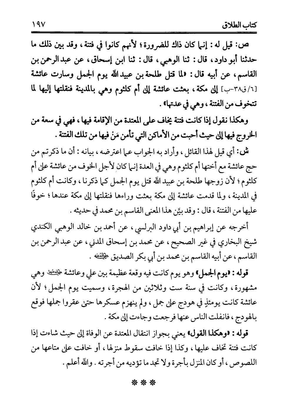 ص: قيل له: إنما كان ذاك للضرورة؛ لأنهم كانوا في فتنة، وقد بين ذلك ما حدثنا أبو داود، قال: ثنا الوهبي، قال: ثنا ابن إسحاق، عن عبد الرحمن بن القاسم، عن أبيه قال: "لما قتل طلحة بن عبيد الله يوم الجمل وسارت عائشة إلى مكة، بعثت عائشة إلى أم كلثوم وهم بالمدينة فنقلتها إليها لما تتخوف من الفتنة، وهي في عدتها".